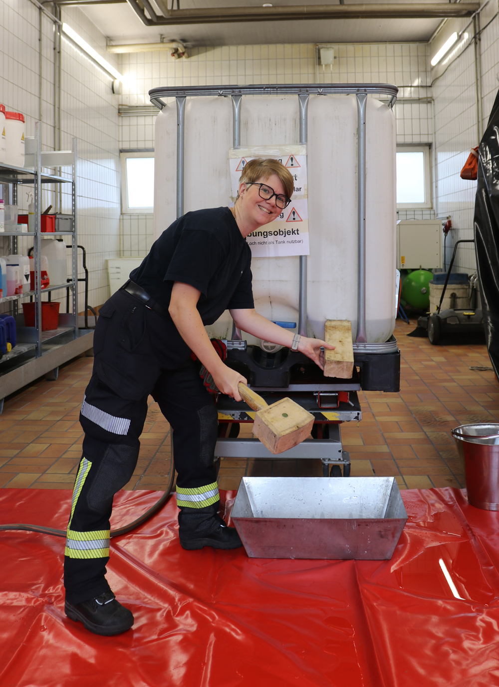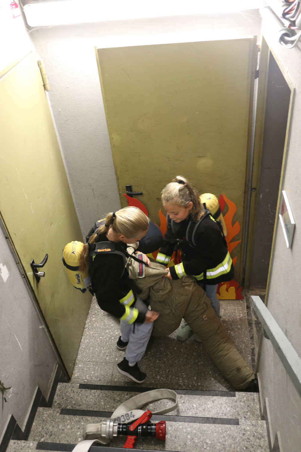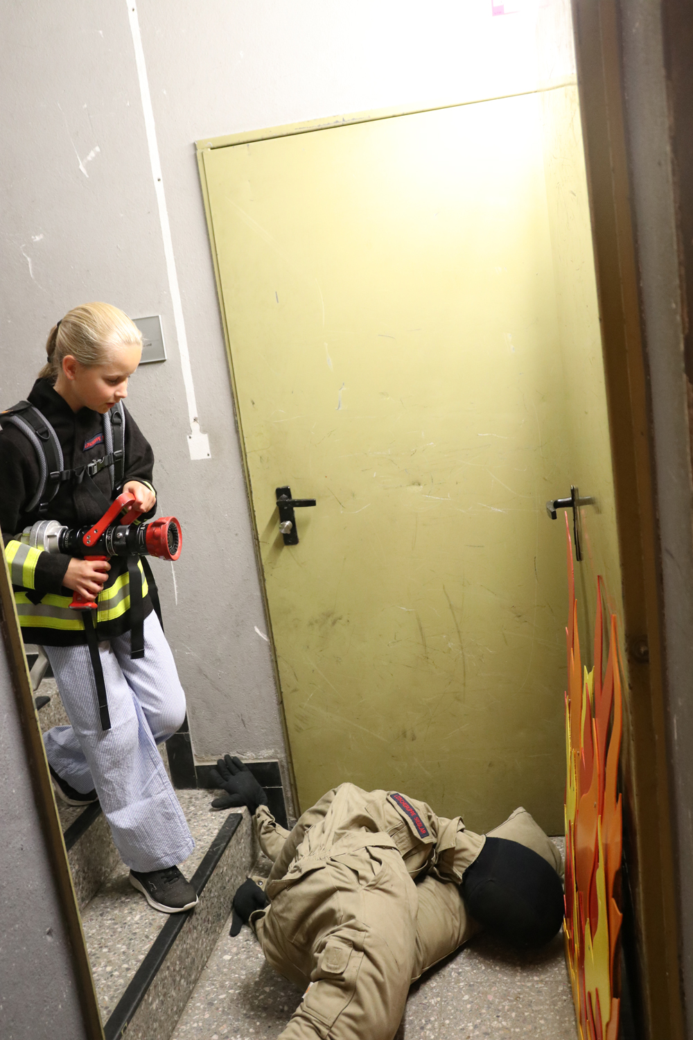 An der Mitmach-Aktion "Kellerbrand" wurde sich mit Feuerwehrschutzkleidung und einem Atemschutzgerät ausgerüstet und zur Menschenrettung in den brennenden Keller vorgegangen – wie bei einem echten Einsatz der Feuerwehr.
