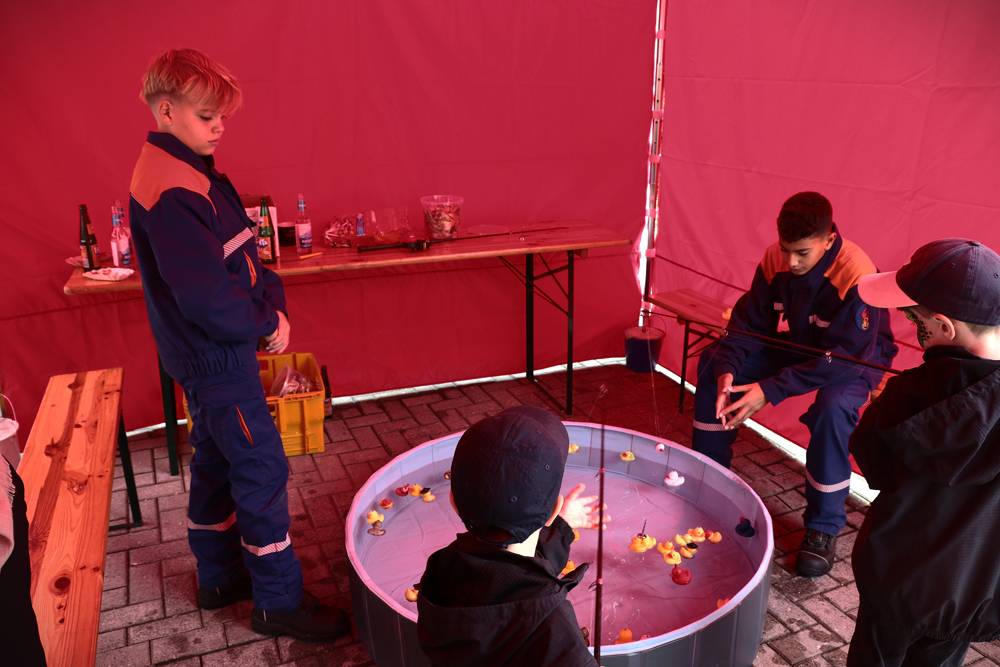 Mit einer Spielekarte konnten die Kinder mit einem Feuerwehrschlauch ein "brennendes Haus" löschen, Enten angeln, Kisten stapeln und Armbänder zum Mitnehmen basteln.
