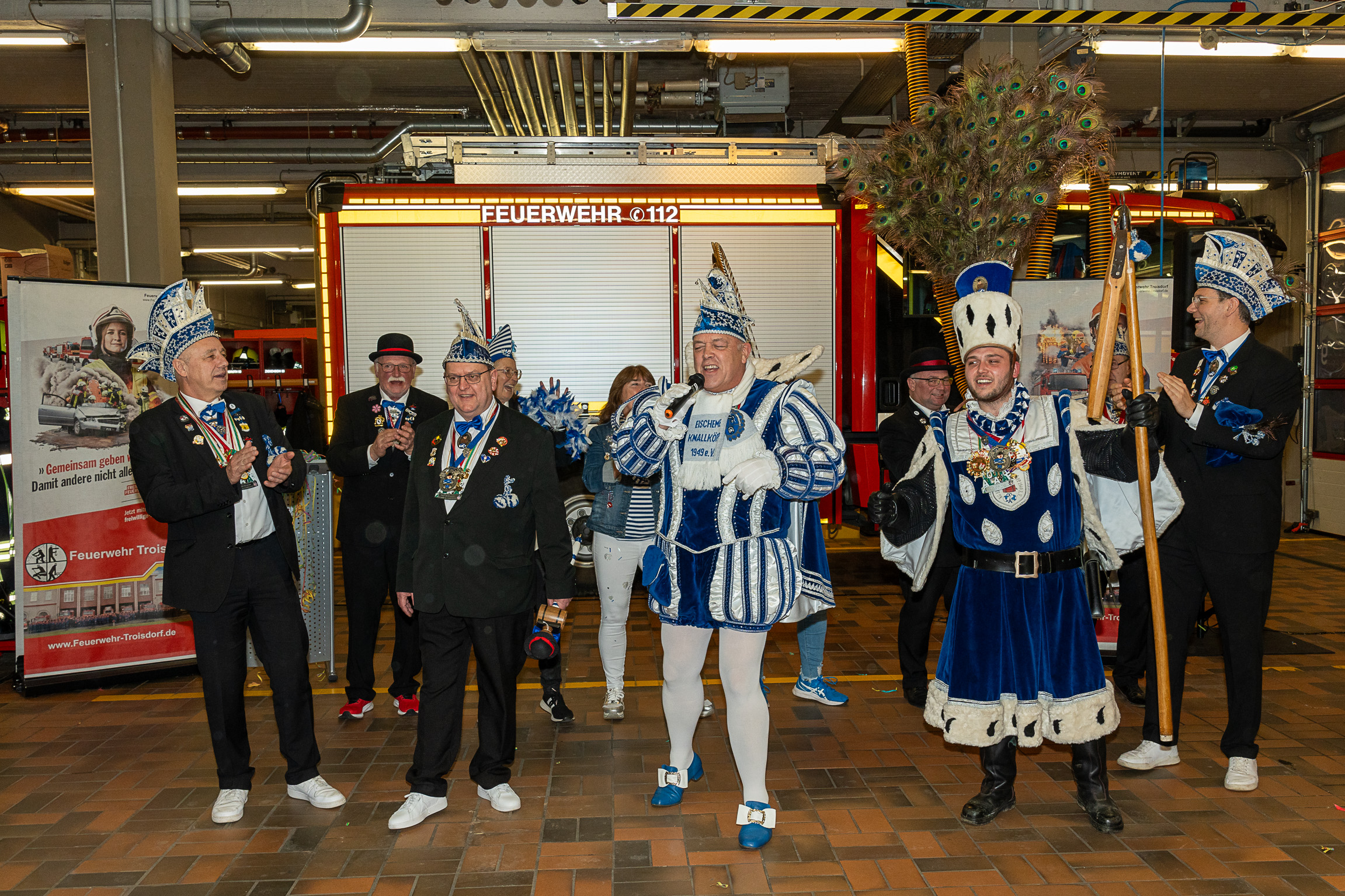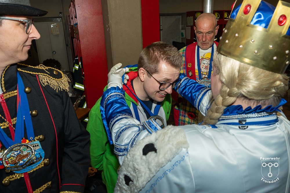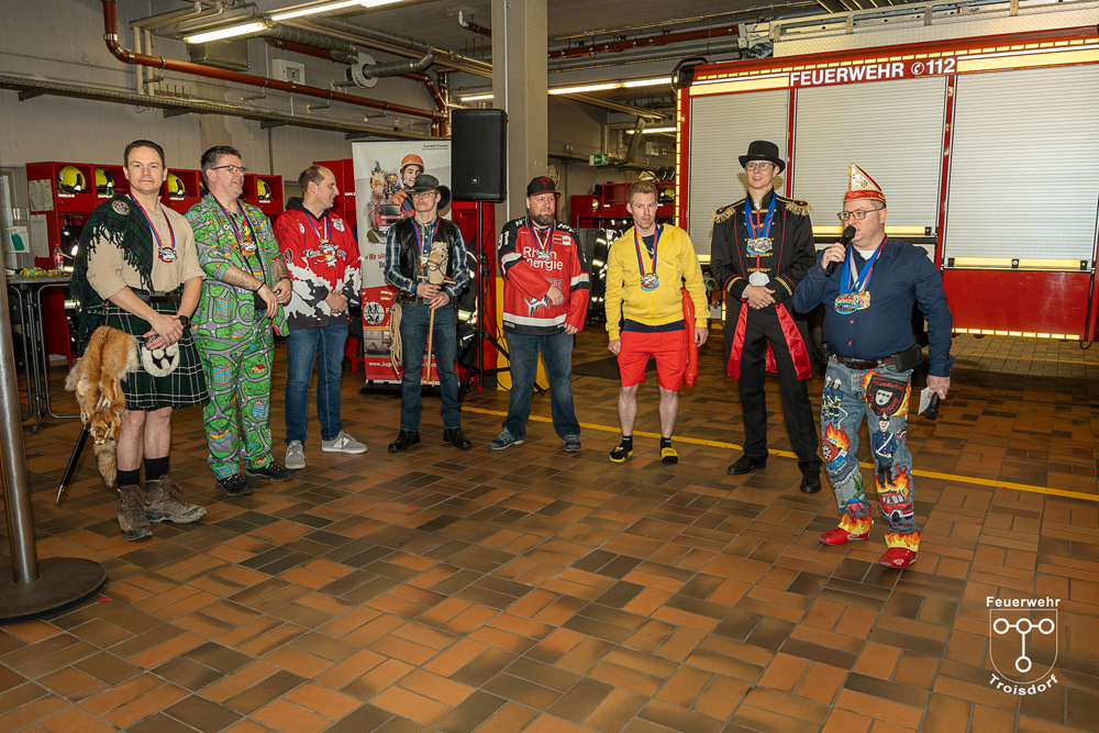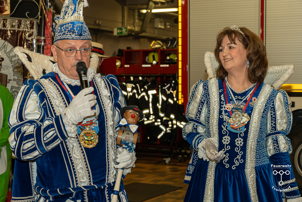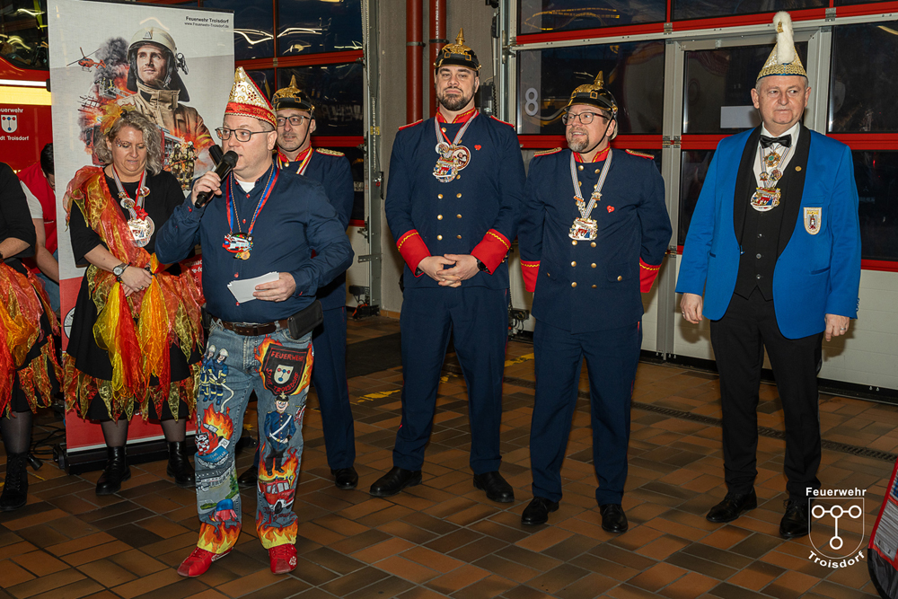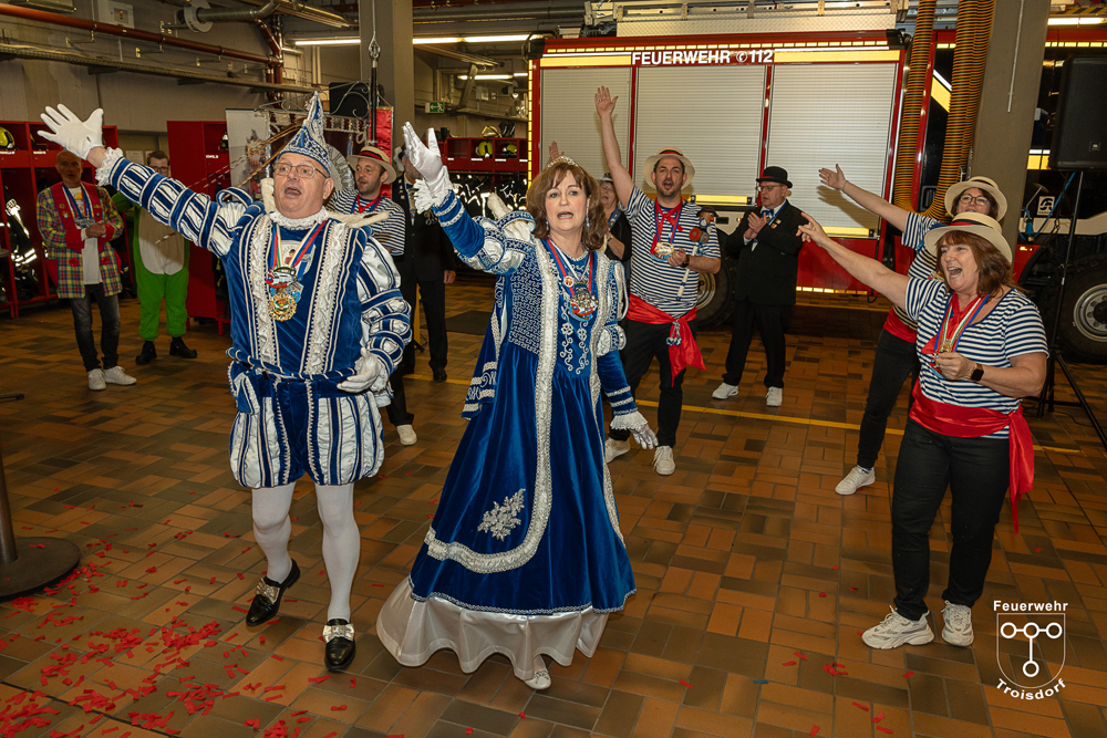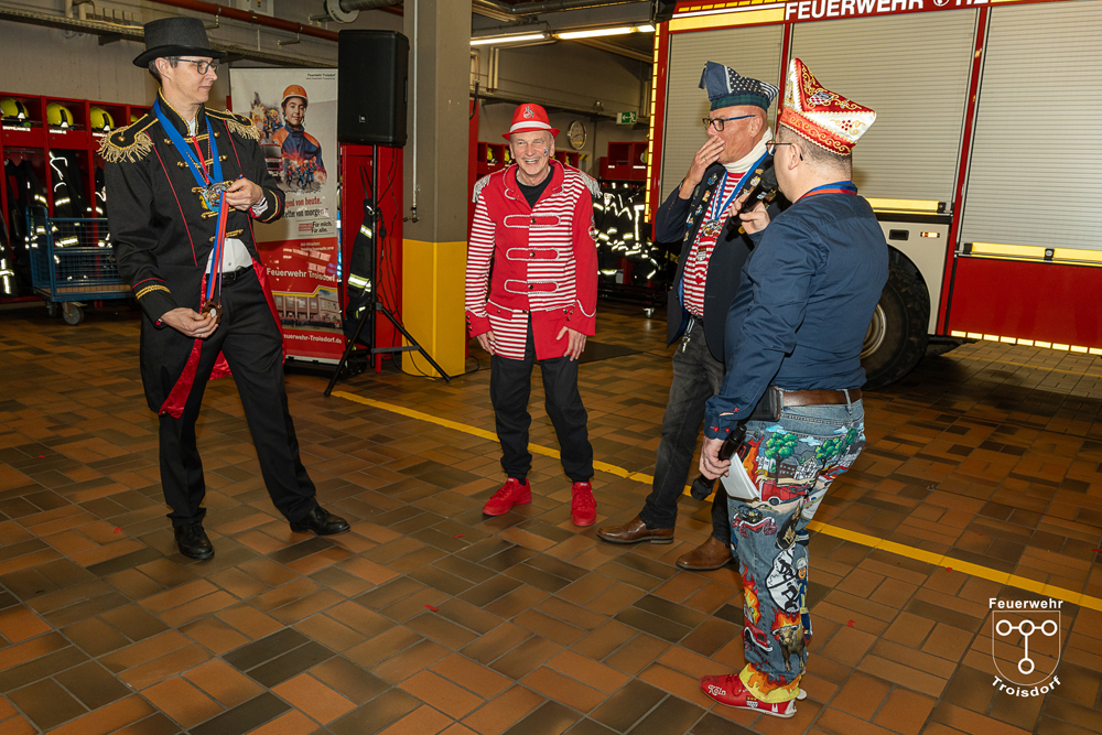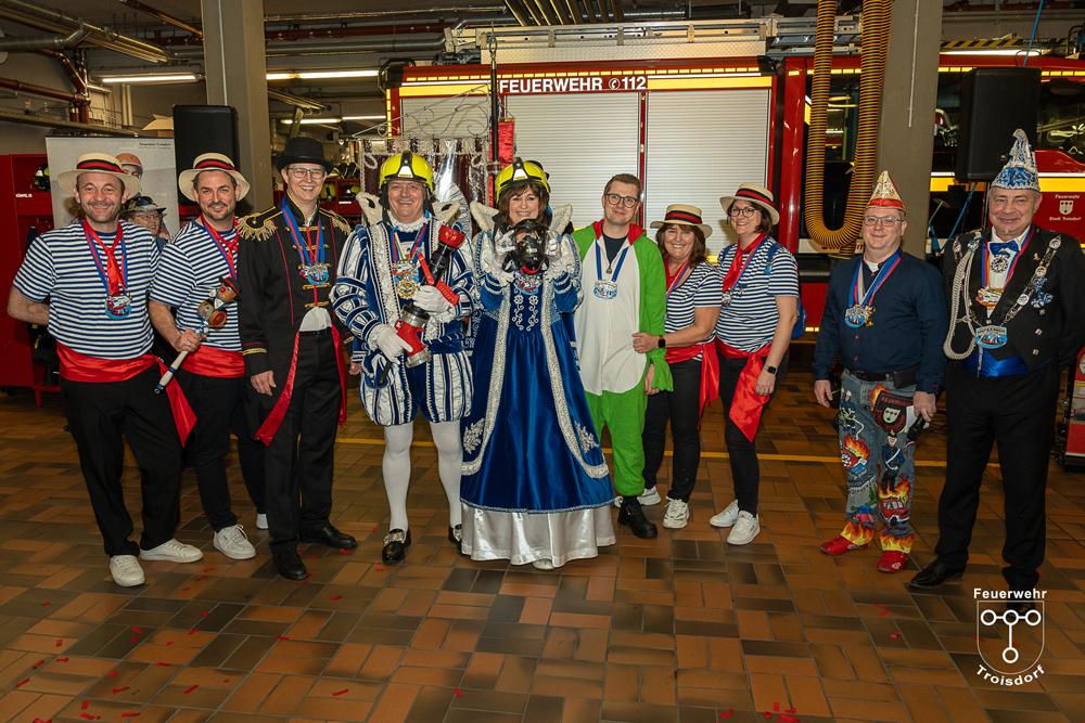 Nach ihren kurzweiligen und abwechslungsreichen Auftritten und Darbietungen in der Fahrzeughalle wurde jeweils noch ein Gruppenfoto mit den Tollitäten, der Leitung der Feuerwehr Troisdorf Lars Gödel, Maximilian Wiesk-emper, Hans-Jürgen Spies und Organisator Tobias Diepenseifen gemacht. Dafür wurde der hölzerne Dreschflegel des Bauern gegen eine hölzerne Feuerwehr-Axt, der Spiegel der Jungfrau gegen eine Atemschutzmaske (zum Durchschauen) sowie das Zepter des Prinzen (das Zeichen der Macht) gegen ein modernes Hohlstrahlrohr (als symbolisches Zeichen über die Macht des Feuers) ausgetauscht. Prinz und Bauer erhielten zusätzlich noch eine andere Kopfbedeckung in Form eines neuen Feuerwehrhelms. Diese neuen Feuerwehrhelme wurden Ende des letzten Jahres bei der Feuerwehr Troisdorf eingeführt und ersetzen die in die Jahre gekommenen alten Helm-Modelle.