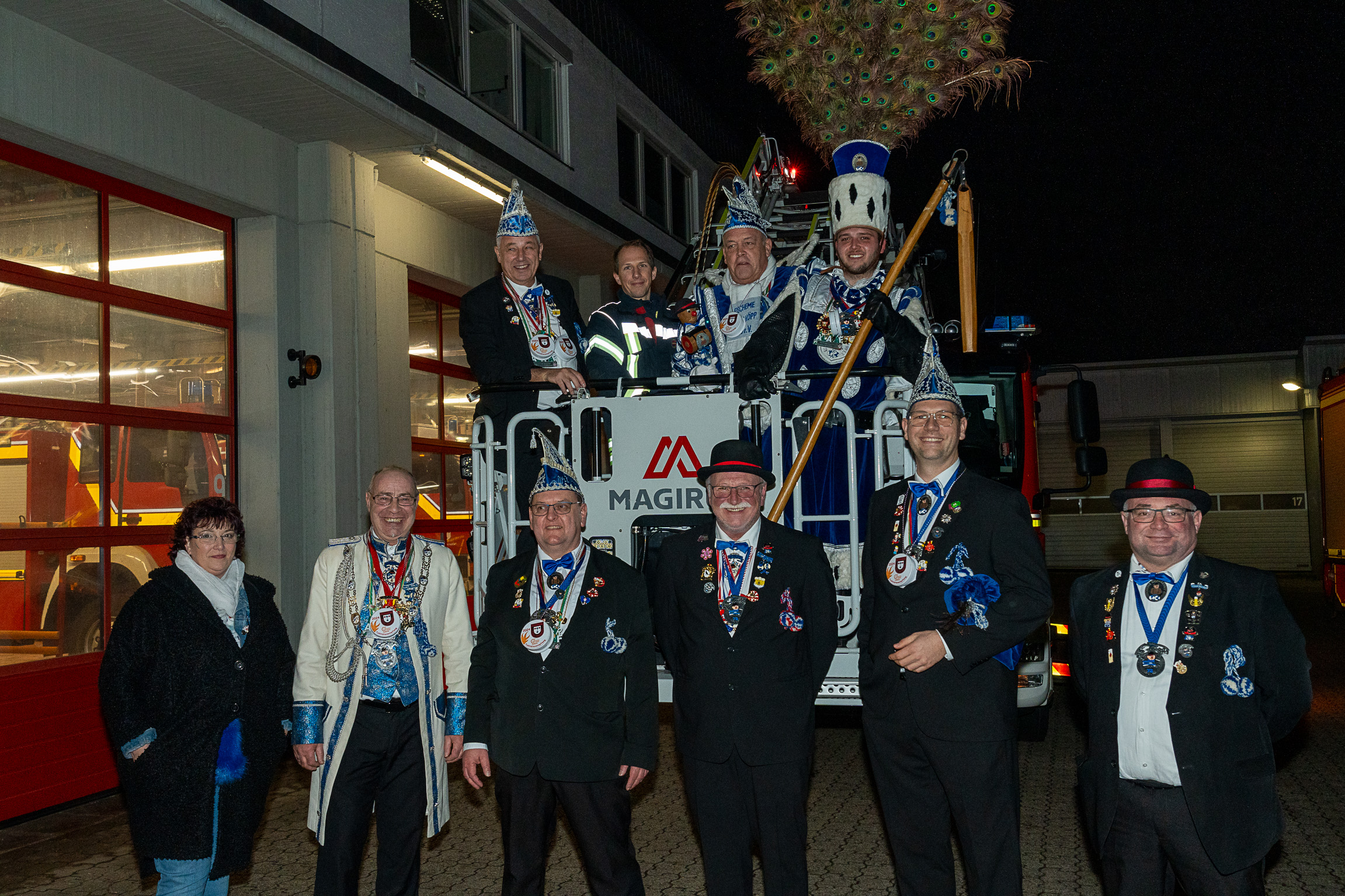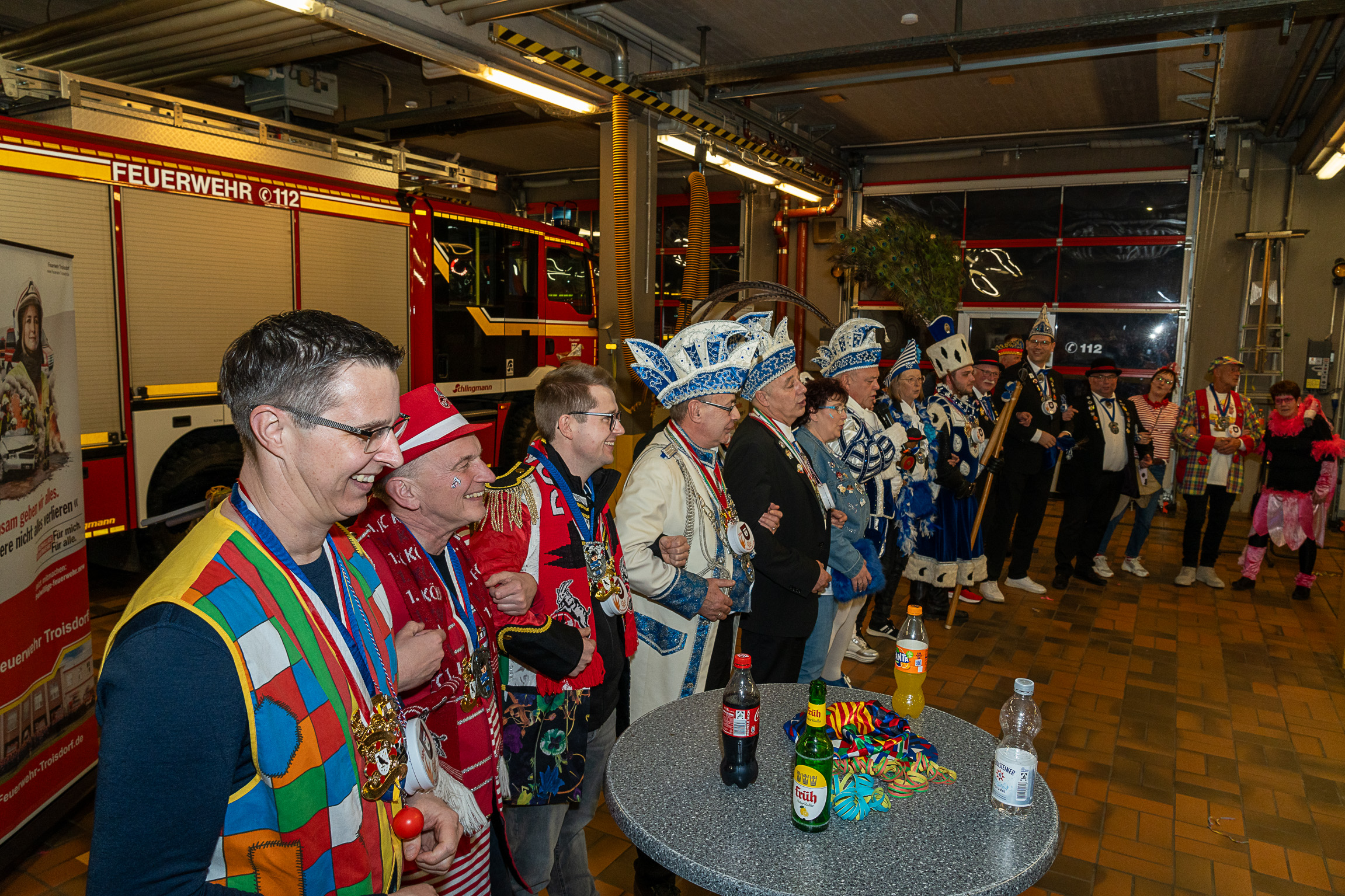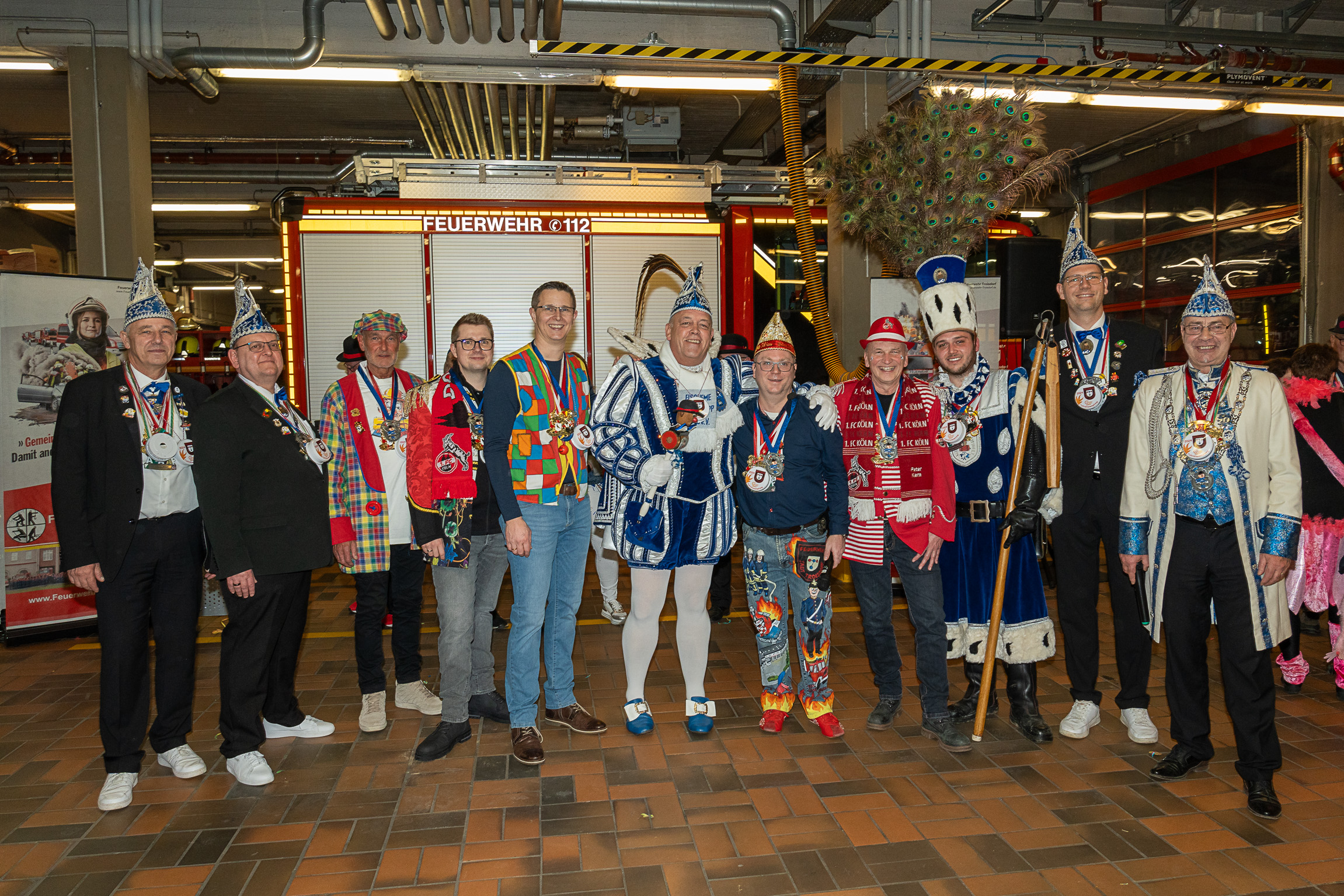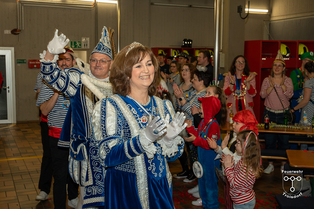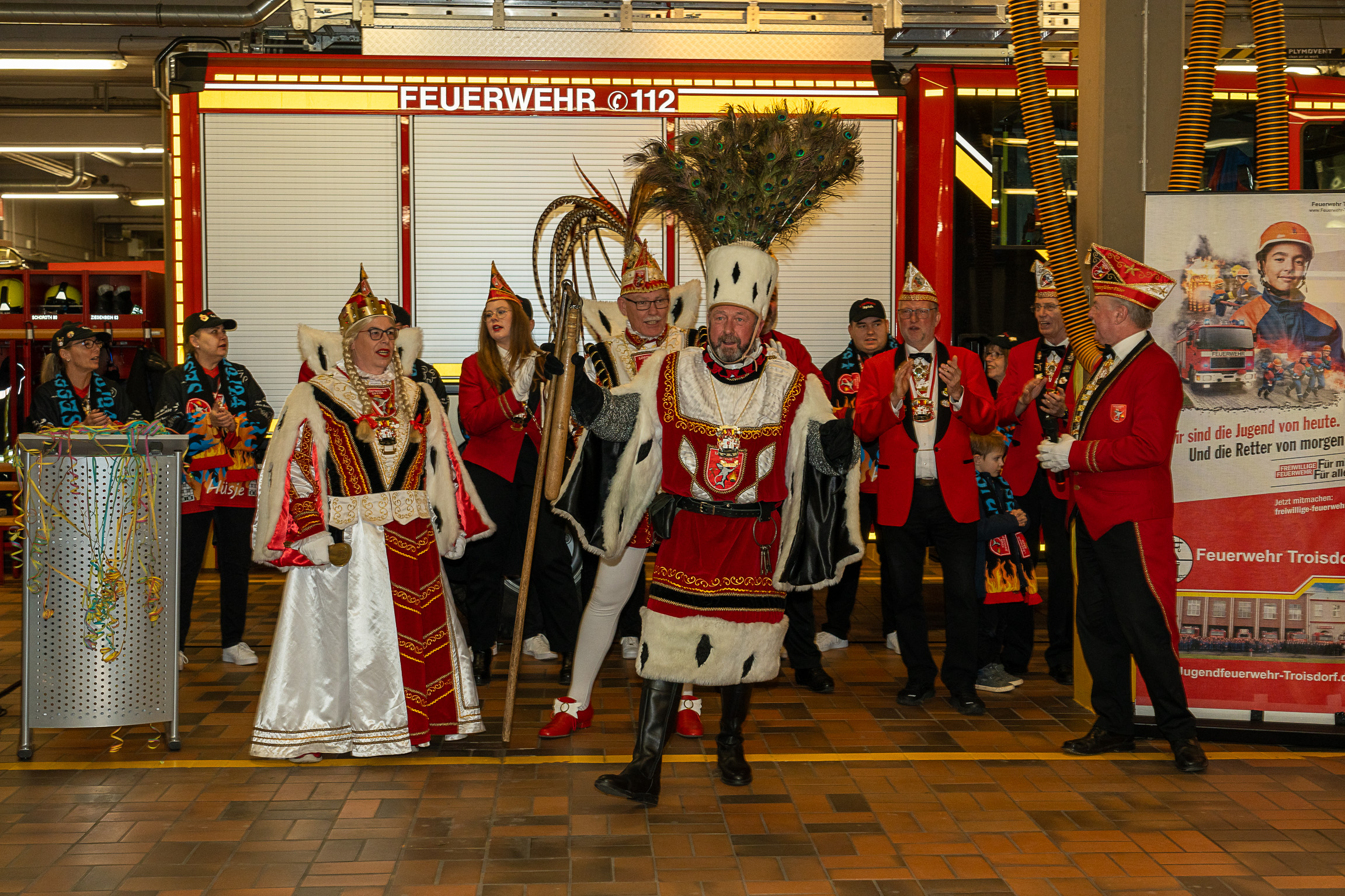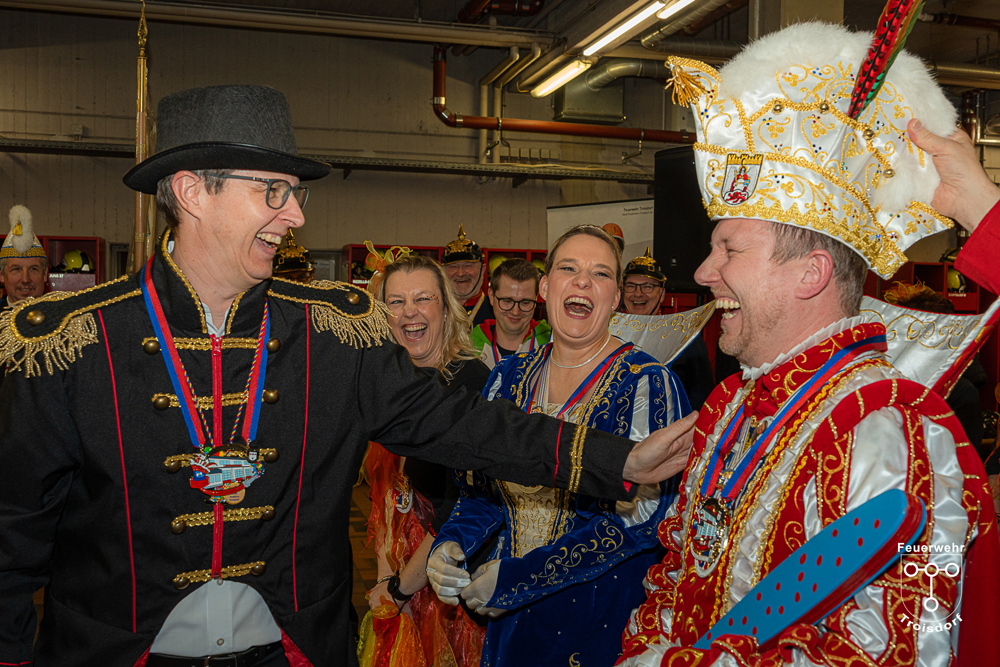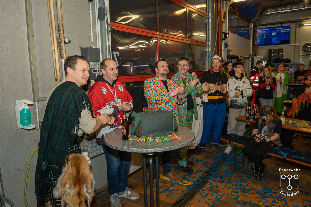 Nach ihren kurzweiligen und abwechslungsreichen Auftritten und Darbietungen in der Fahrzeughalle wurde jeweils noch ein Gruppenfoto mit den Tollitäten, der Leitung der Feuerwehr Troisdorf Lars Gödel, Maximilian Wiesk-emper, Hans-Jürgen Spies und Organisator Tobias Diepenseifen gemacht. Dafür wurde der hölzerne Dreschflegel des Bauern gegen eine hölzerne Feuerwehr-Axt, der Spiegel der Jungfrau gegen eine Atemschutzmaske (zum Durchschauen) sowie das Zepter des Prinzen (das Zeichen der Macht) gegen ein modernes Hohlstrahlrohr (als symbolisches Zeichen über die Macht des Feuers) ausgetauscht. Prinz und Bauer erhielten zusätzlich noch eine andere Kopfbedeckung in Form eines neuen Feuerwehrhelms. Diese neuen Feuerwehrhelme wurden Ende des letzten Jahres bei der Feuerwehr Troisdorf eingeführt und ersetzen die in die Jahre gekommenen alten Helm-Modelle.