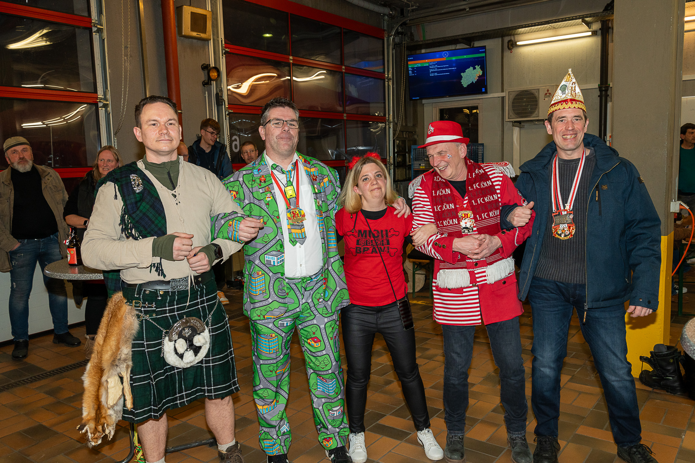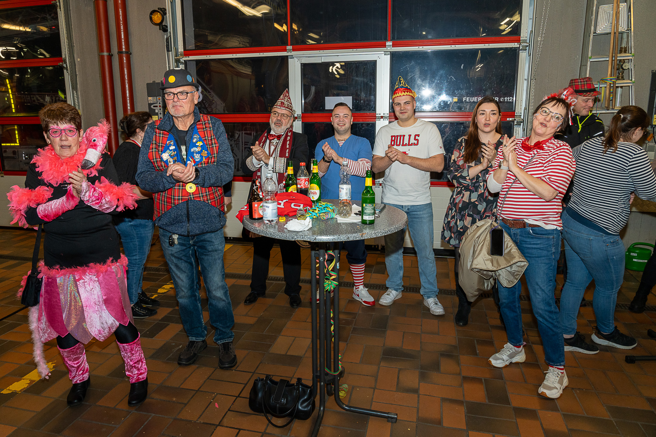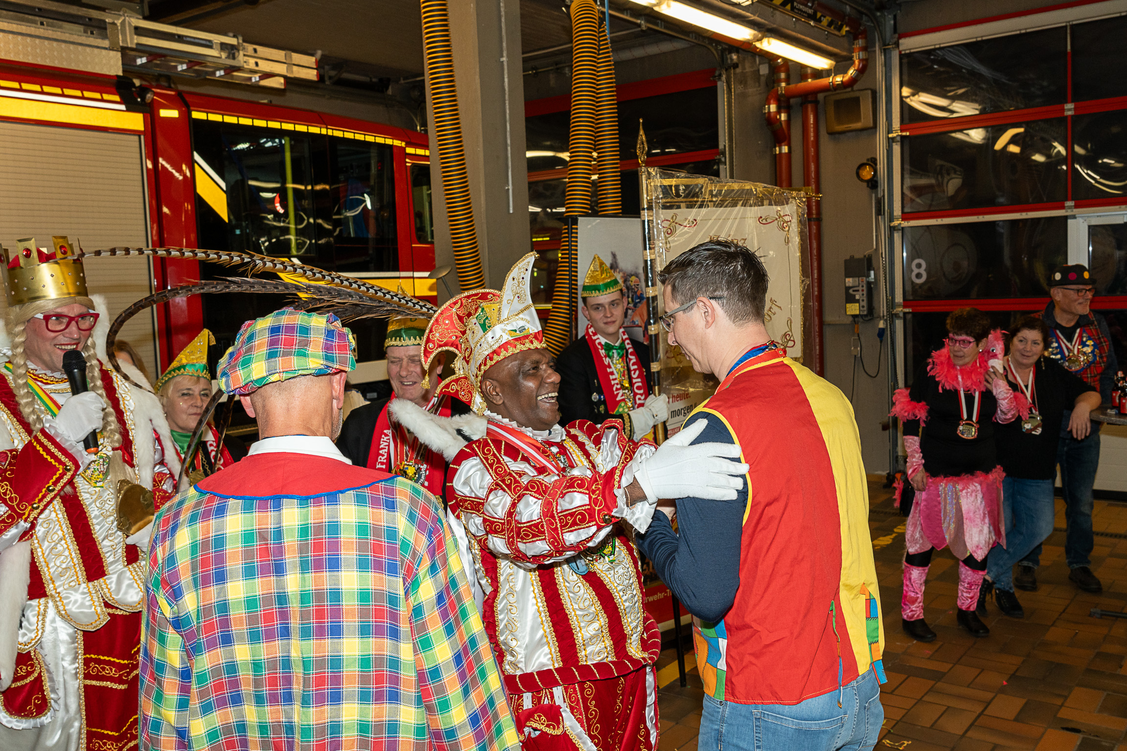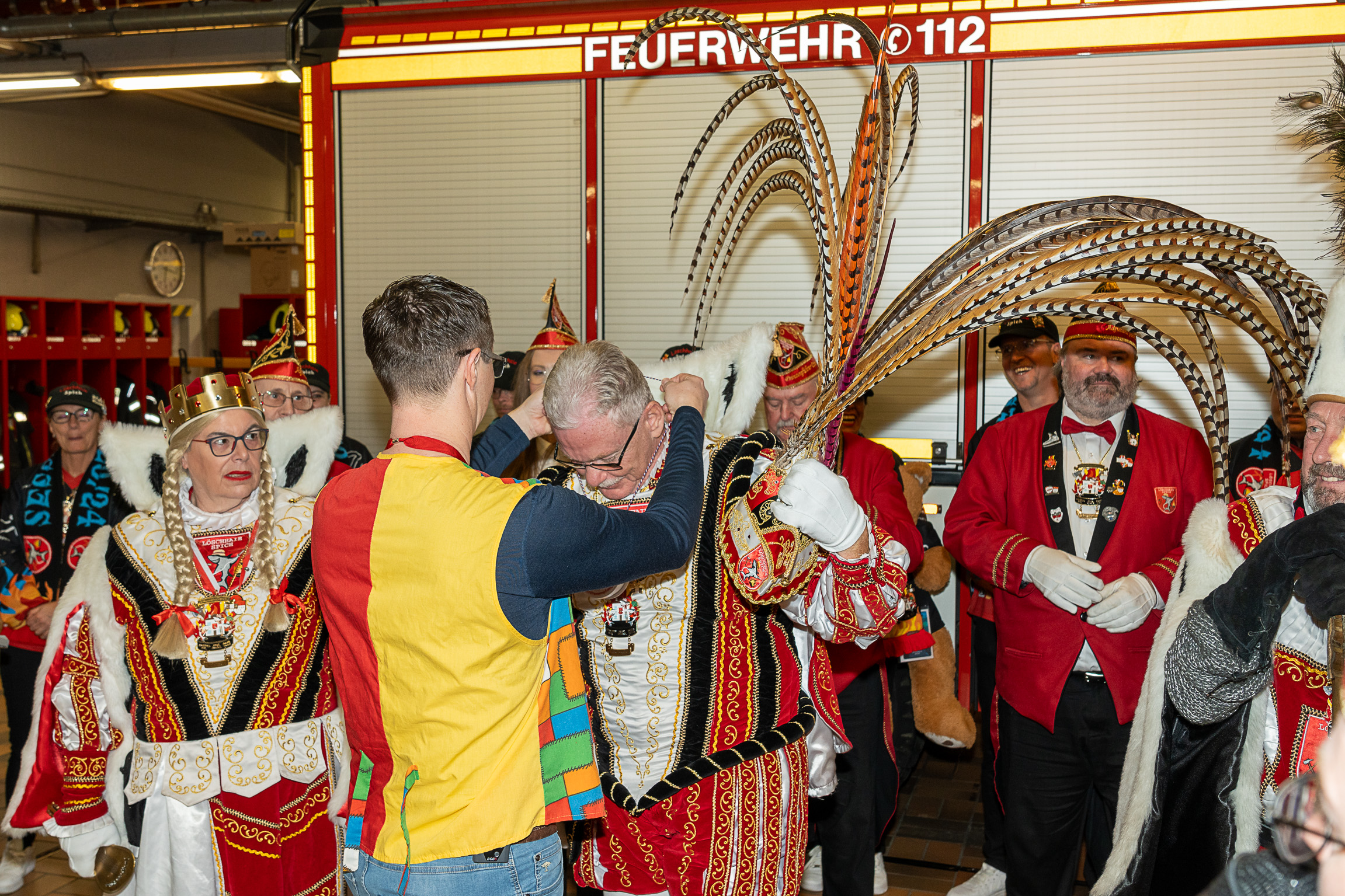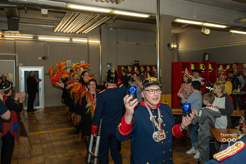 Nach ihren kurzweiligen und abwechslungsreichen Auftritten und Darbietungen in der Fahrzeughalle wurde jeweils noch ein Gruppenfoto mit den Tollitäten, der Leitung der Feuerwehr Troisdorf Lars Gödel, Maximilian Wiesk-emper, Hans-Jürgen Spies und Organisator Tobias Diepenseifen gemacht. Dafür wurde der hölzerne Dreschflegel des Bauern gegen eine hölzerne Feuerwehr-Axt, der Spiegel der Jungfrau gegen eine Atemschutzmaske (zum Durchschauen) sowie das Zepter des Prinzen (das Zeichen der Macht) gegen ein modernes Hohlstrahlrohr (als symbolisches Zeichen über die Macht des Feuers) ausgetauscht. Prinz und Bauer erhielten zusätzlich noch eine andere Kopfbedeckung in Form eines neuen Feuerwehrhelms. Diese neuen Feuerwehrhelme wurden Ende des letzten Jahres bei der Feuerwehr Troisdorf eingeführt und ersetzen die in die Jahre gekommenen alten Helm-Modelle.