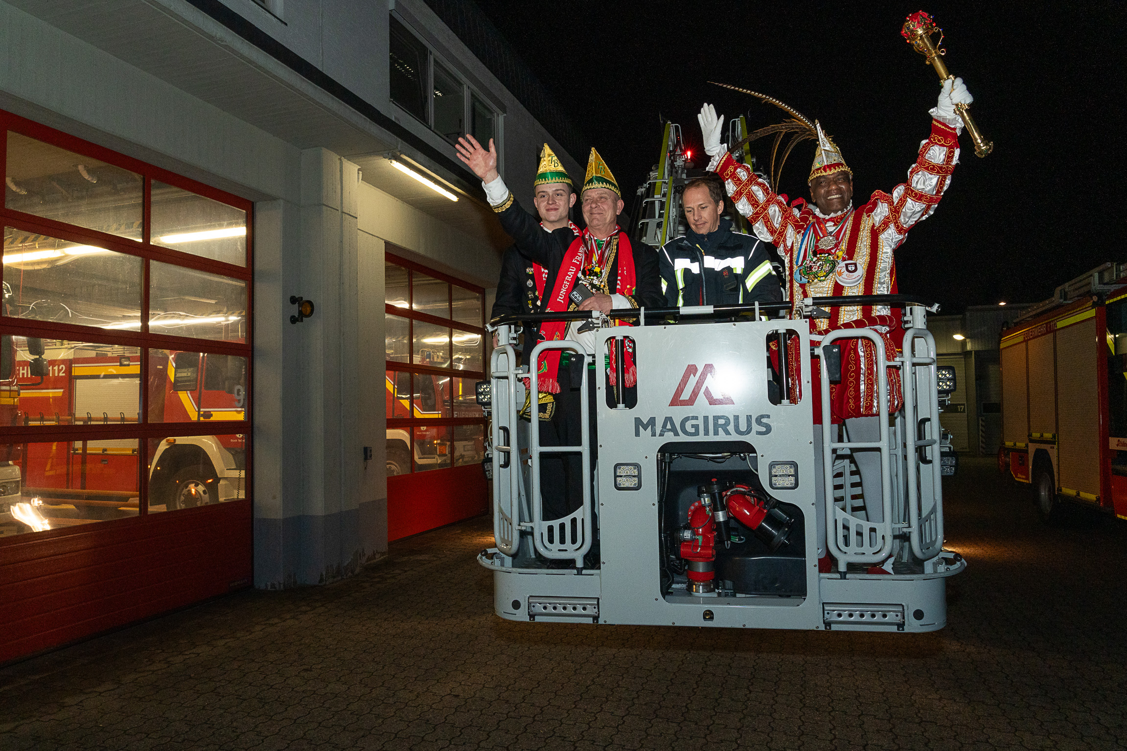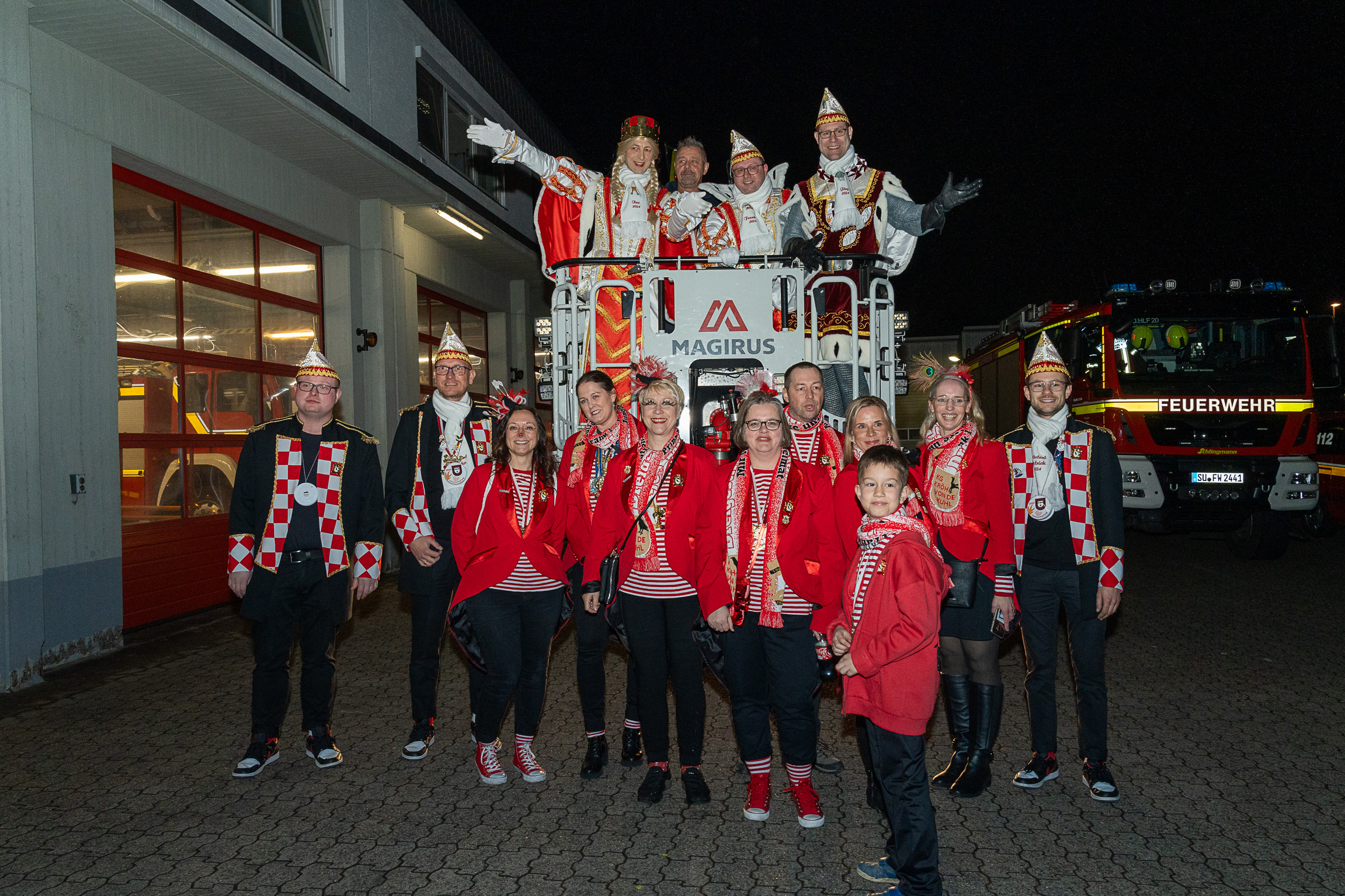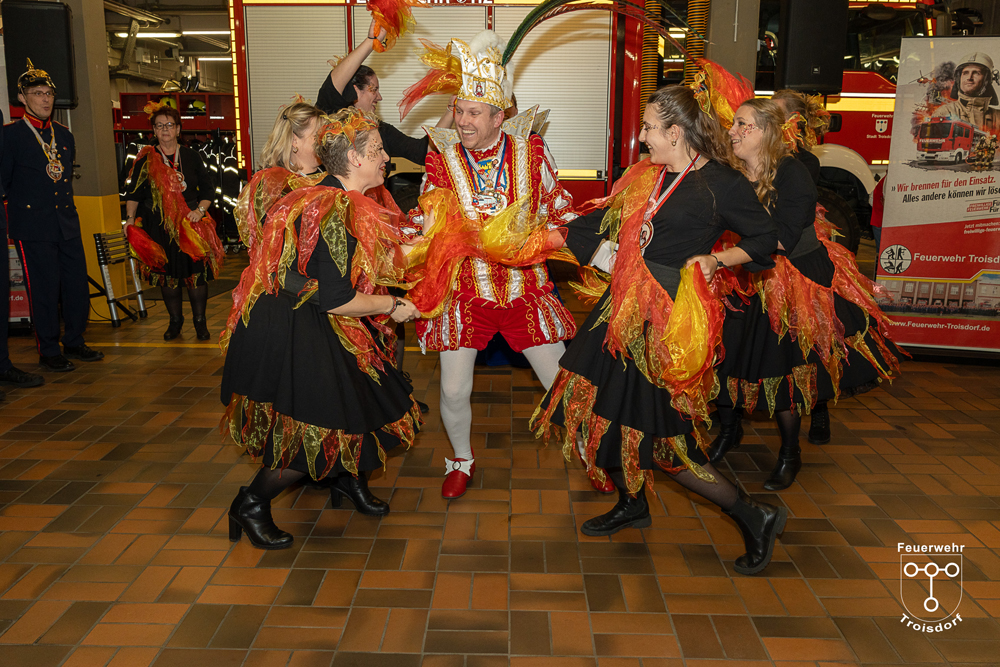 Nach ihren kurzweiligen und abwechslungsreichen Auftritten und Darbietungen in der Fahrzeughalle wurde jeweils noch ein Gruppenfoto mit den Tollitäten, der Leitung der Feuerwehr Troisdorf Lars Gödel, Maximilian Wieskemper, Hans-Jürgen Spies und Organisator Tobias Diepenseifen gemacht. Dafür wurden, sofern vorhanden, die Spiegel der Prinzessinnen und Jungfrauen gegen eine Atemschutzmaske (zum Durchschauen), der Dreschflegel des Troisdorfer Bauern gegen eine hölzerne Feuerwehr-Axt sowie die Zepter (das Zeichen der Macht) der Prinzen gegen ein modernes Hohlstrahlrohr (als symbolisches Zeichen über die Macht des Feuers) ausgetauscht. Alle Tollitäten erhielten zusätzlich noch eine andere Kopfbedeckung in Form eines neuen Feuerwehrhelms.