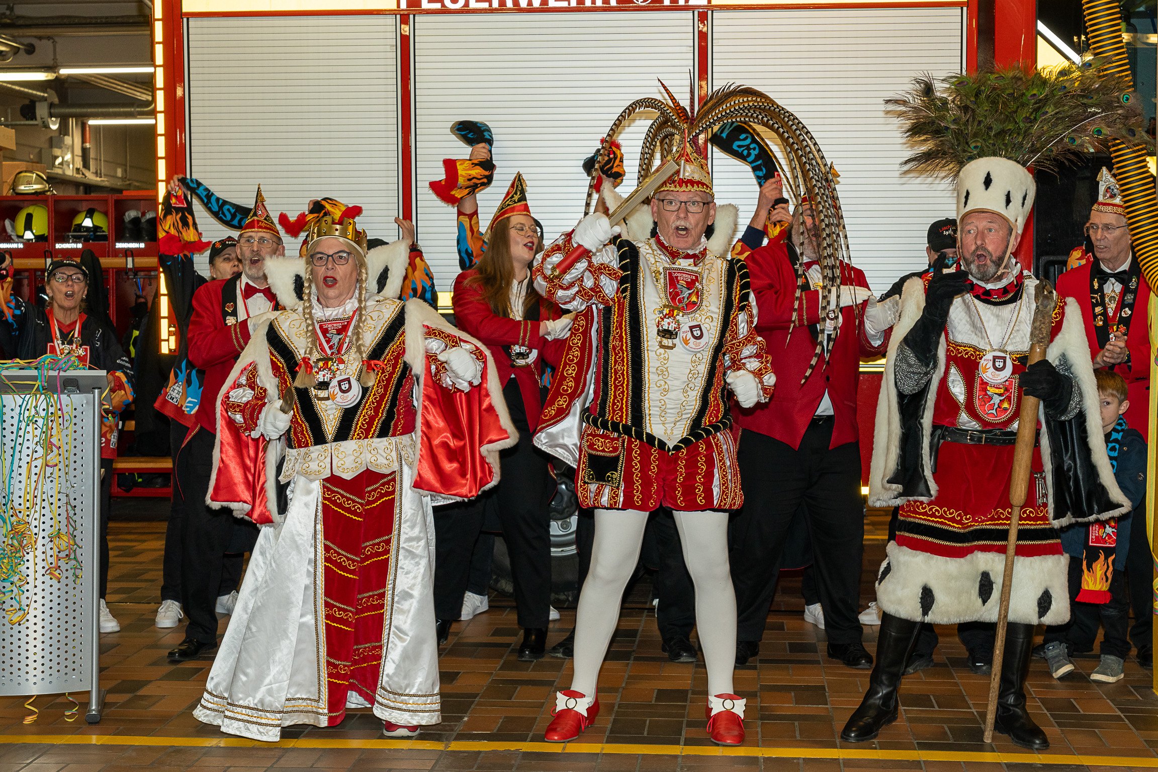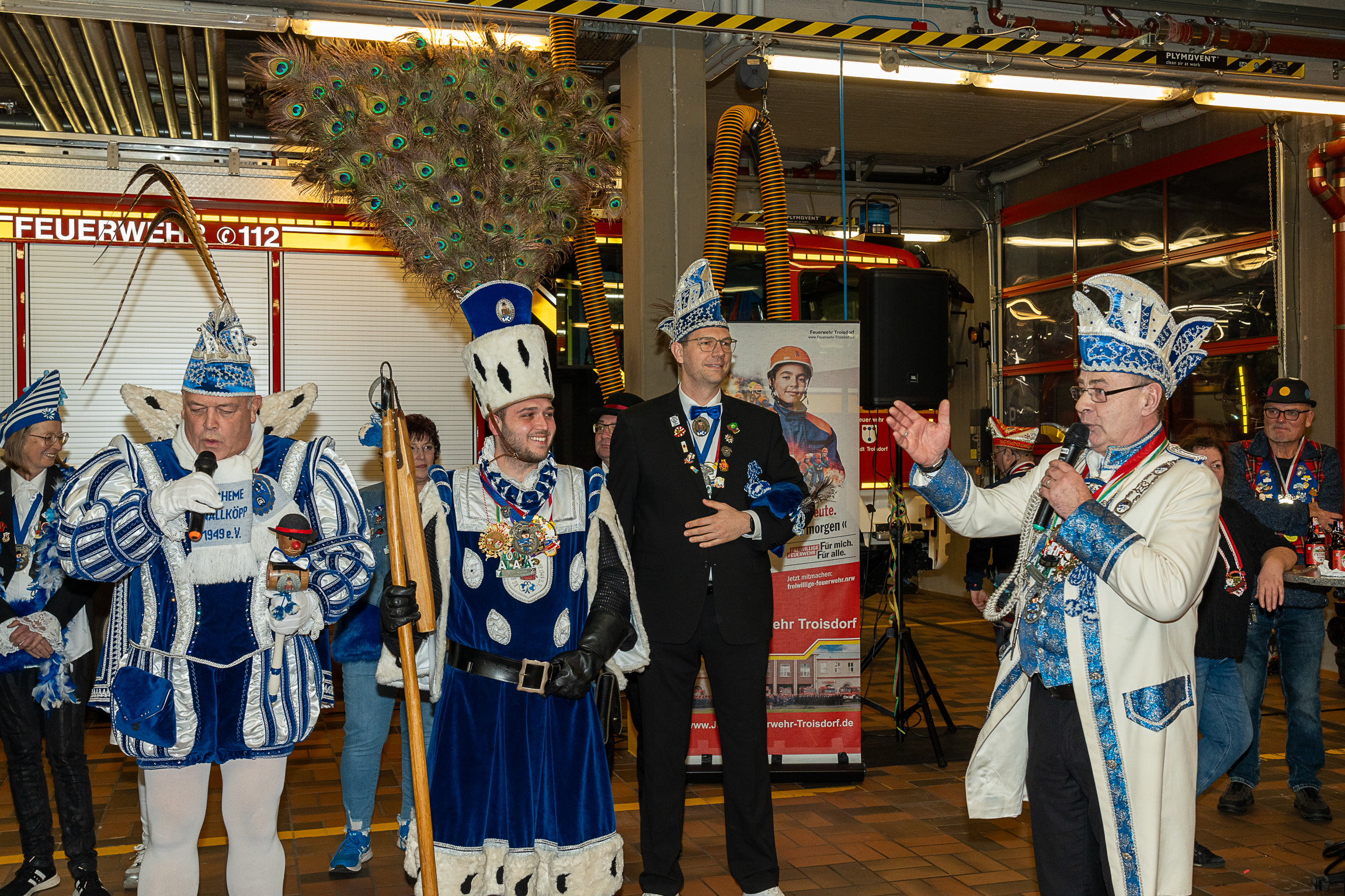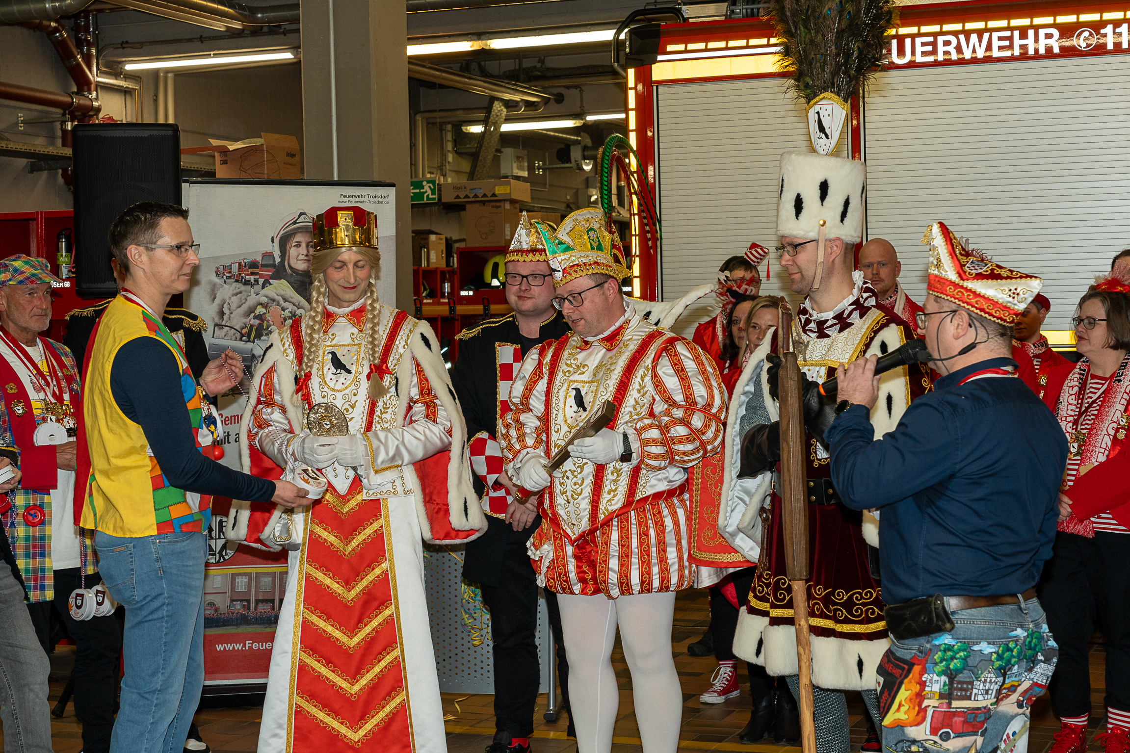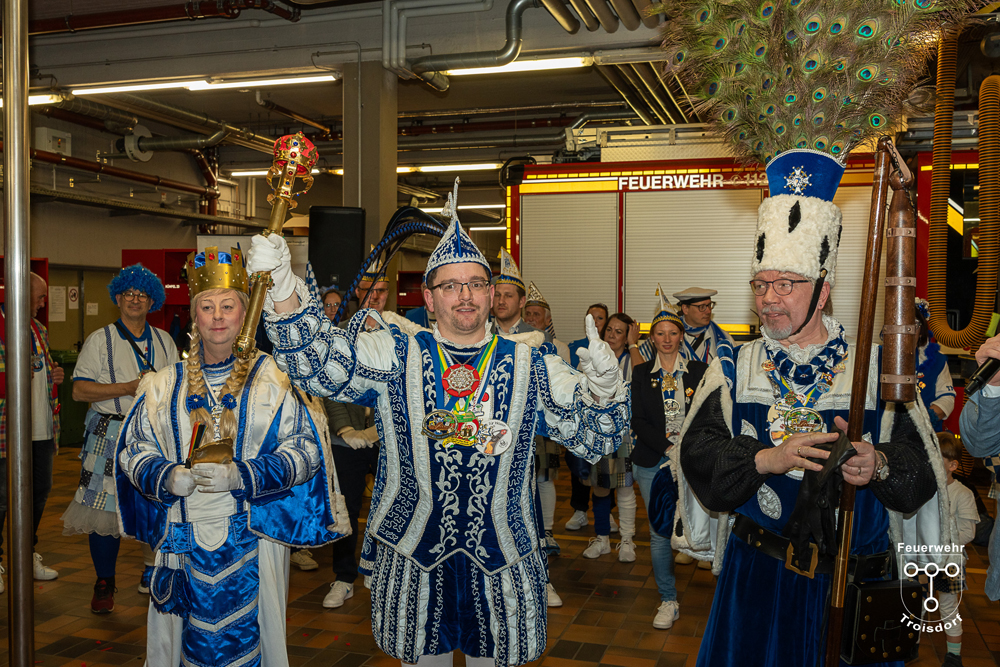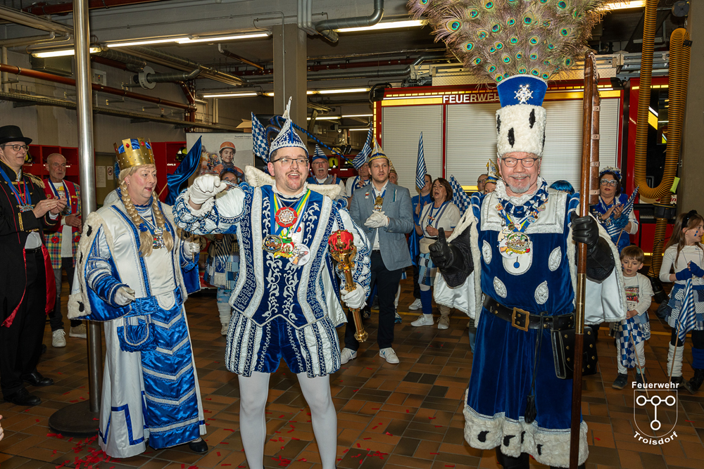 Alle fünf Troisdorfer Dreigestirne aus den Ortsteilen Spich, Müllekoven, Eschmar, Friedrich-Wilhelms-Hütte und dem Stadtzentrum hatten sich zum Empfang angemeldet – leider gab es krankheitsbedingt den ein oder anderen Ausfall. Den Anfang machte das Spicher Dreigestirn mit Prinz Gandi I., dem obersten Feuerwehrchef des Rhein-Sieg-Kreises, Kreisbrandmeister und ehemaligem Leiter der Feuerwehr Troisdorf, Stefan Gandelau, von den Löschhaien Spich. Auch andere Tollitäten haben Verbindungen zur Feuerwehr: Fast alle aus dem Müllekovener Dreigestirn sowie dem Kreis ihrer Adjutanten sind Mitglieder der Löschgruppe Müllekoven. Prinz Ben I. vom Hüttener Kinderdreigestirn ist Mitglied in der Jugendfeuerwehr FWH und seine Bäuerin Toni ist bei der Jugendfeuerwehr in Sieglar. Krankheitsbedingt musste das Kinderdreigestirn ihren Besuch kurzfristig leider absagen.