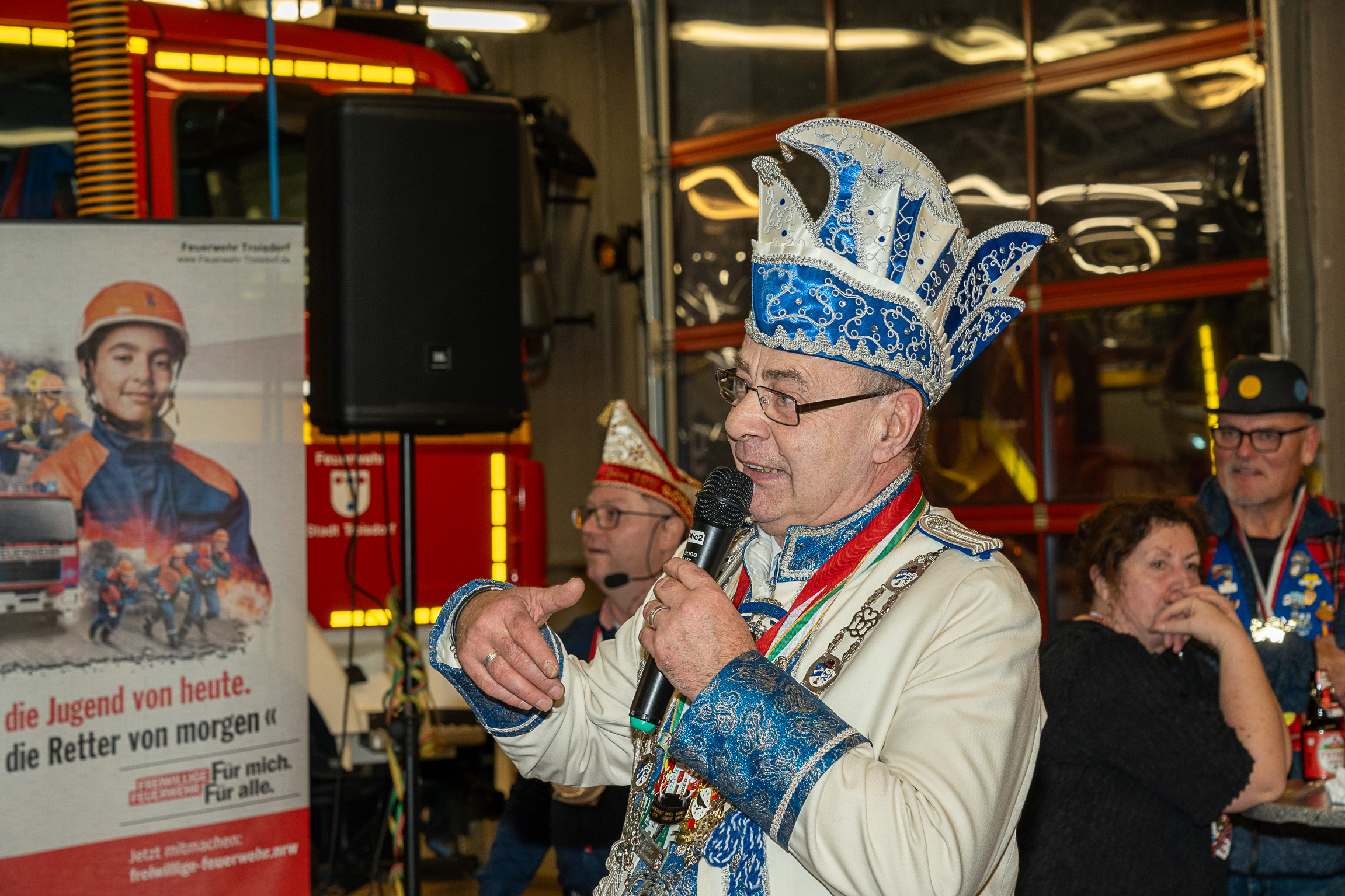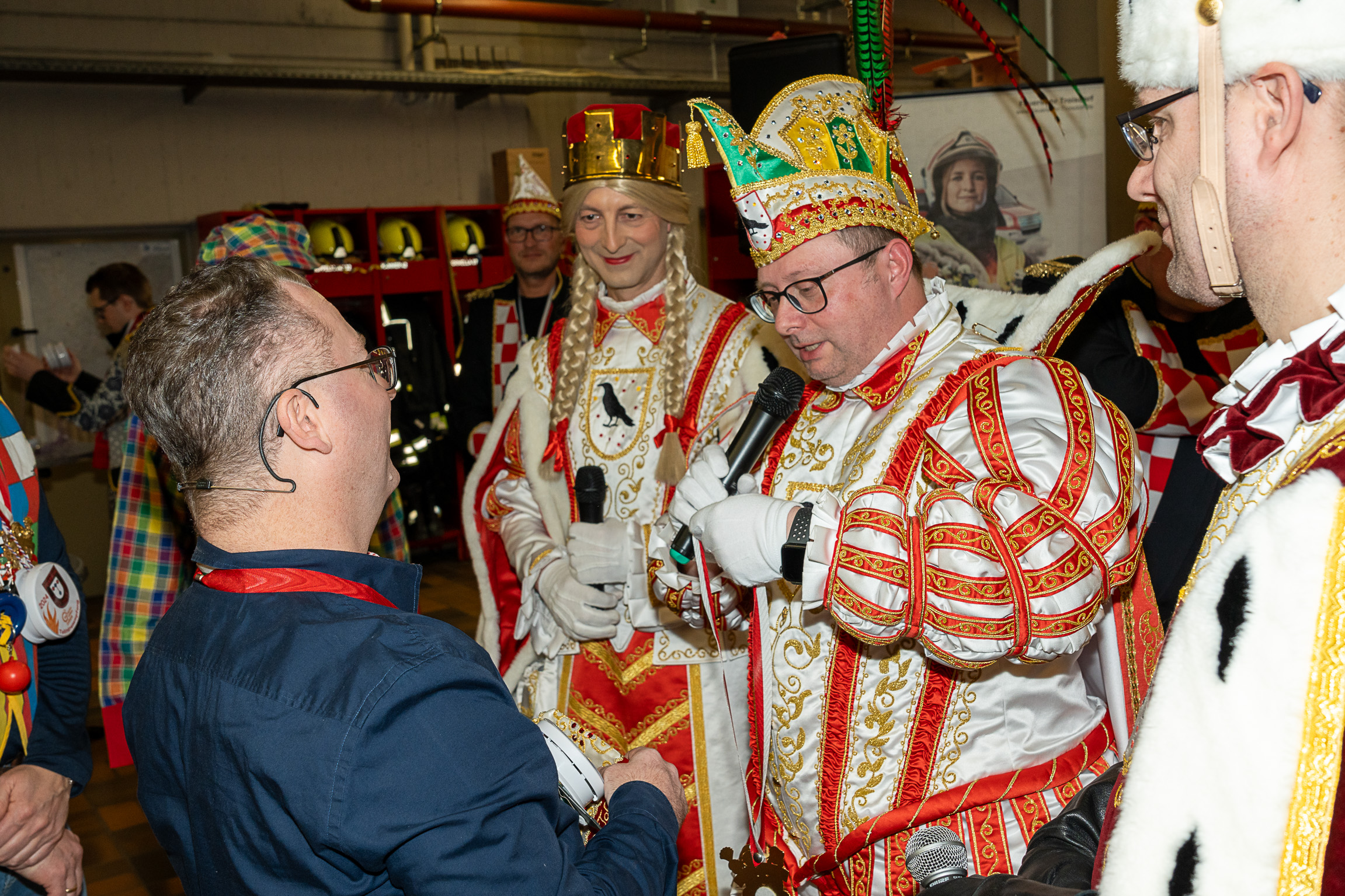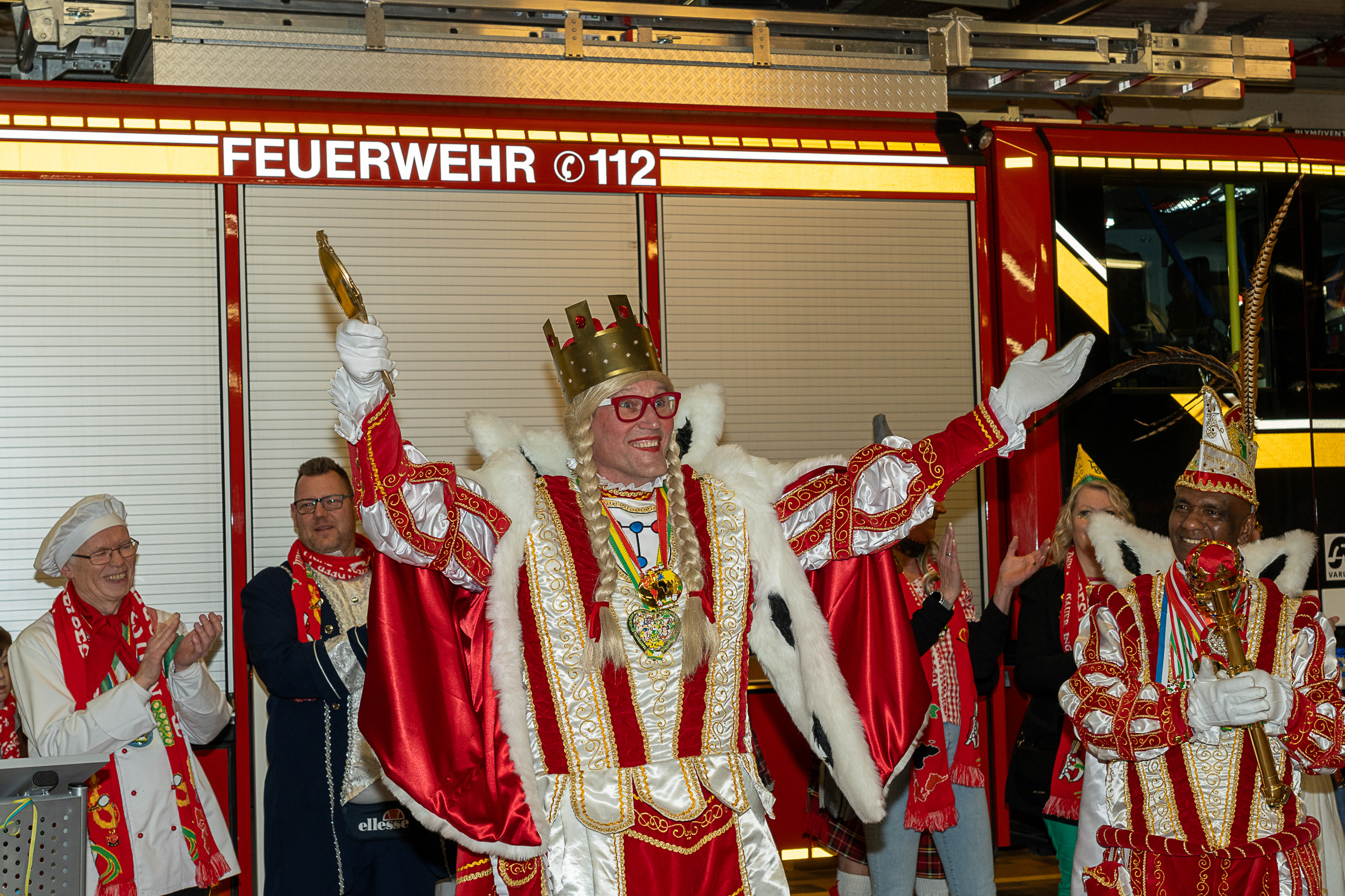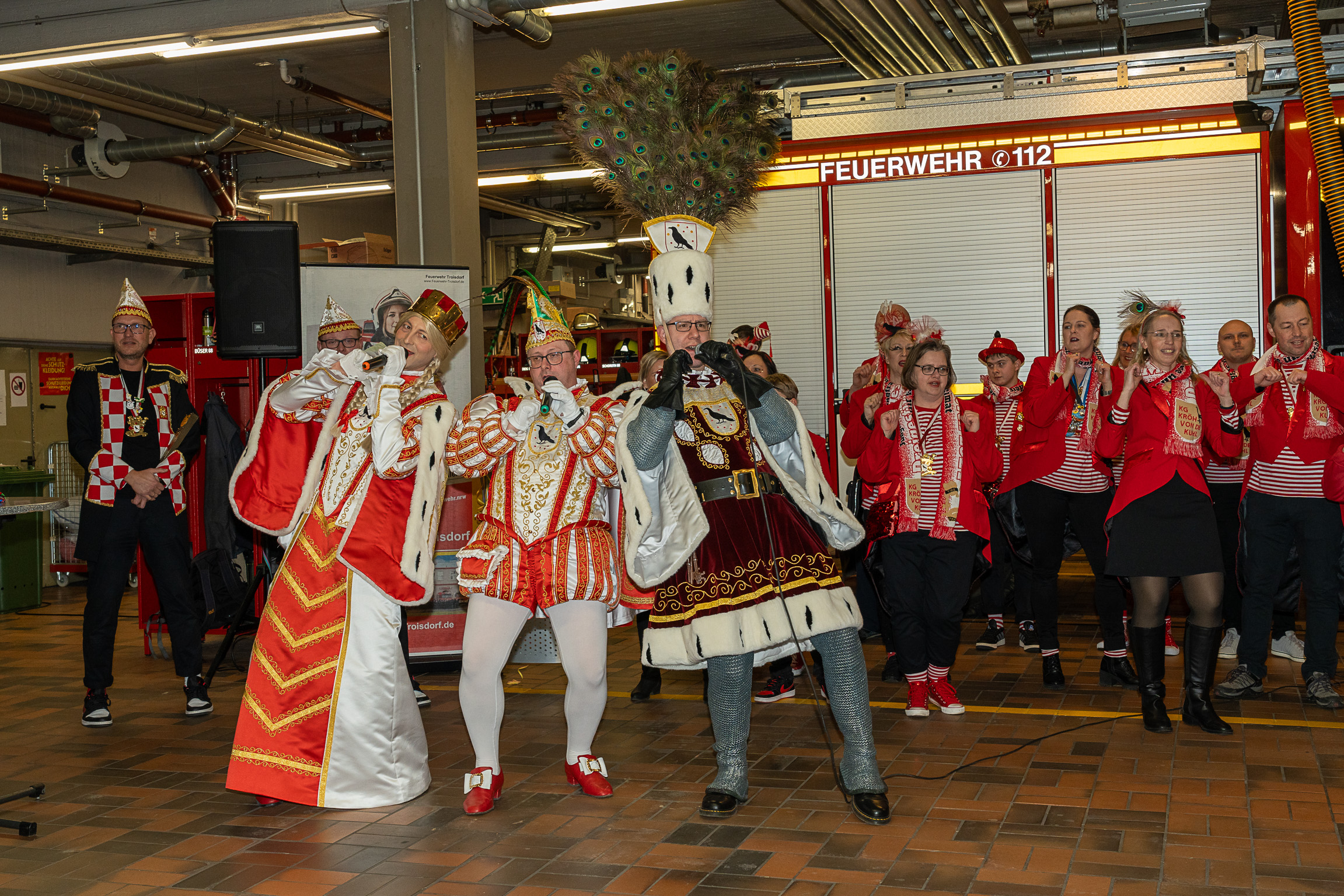 Alle fünf Troisdorfer Dreigestirne aus den Ortsteilen Spich, Müllekoven, Eschmar, Friedrich-Wilhelms-Hütte und dem Stadtzentrum hatten sich zum Empfang angemeldet – leider gab es krankheitsbedingt den ein oder anderen Ausfall. Den Anfang machte das Spicher Dreigestirn mit Prinz Gandi I., dem obersten Feuerwehrchef des Rhein-Sieg-Kreises, Kreisbrandmeister und ehemaligem Leiter der Feuerwehr Troisdorf, Stefan Gandelau, von den Löschhaien Spich. Auch andere Tollitäten haben Verbindungen zur Feuerwehr: Fast alle aus dem Müllekovener Dreigestirn sowie dem Kreis ihrer Adjutanten sind Mitglieder der Löschgruppe Müllekoven. Prinz Ben I. vom Hüttener Kinderdreigestirn ist Mitglied in der Jugendfeuerwehr FWH und seine Bäuerin Toni ist bei der Jugendfeuerwehr in Sieglar. Krankheitsbedingt musste das Kinderdreigestirn ihren Besuch kurzfristig leider absagen.