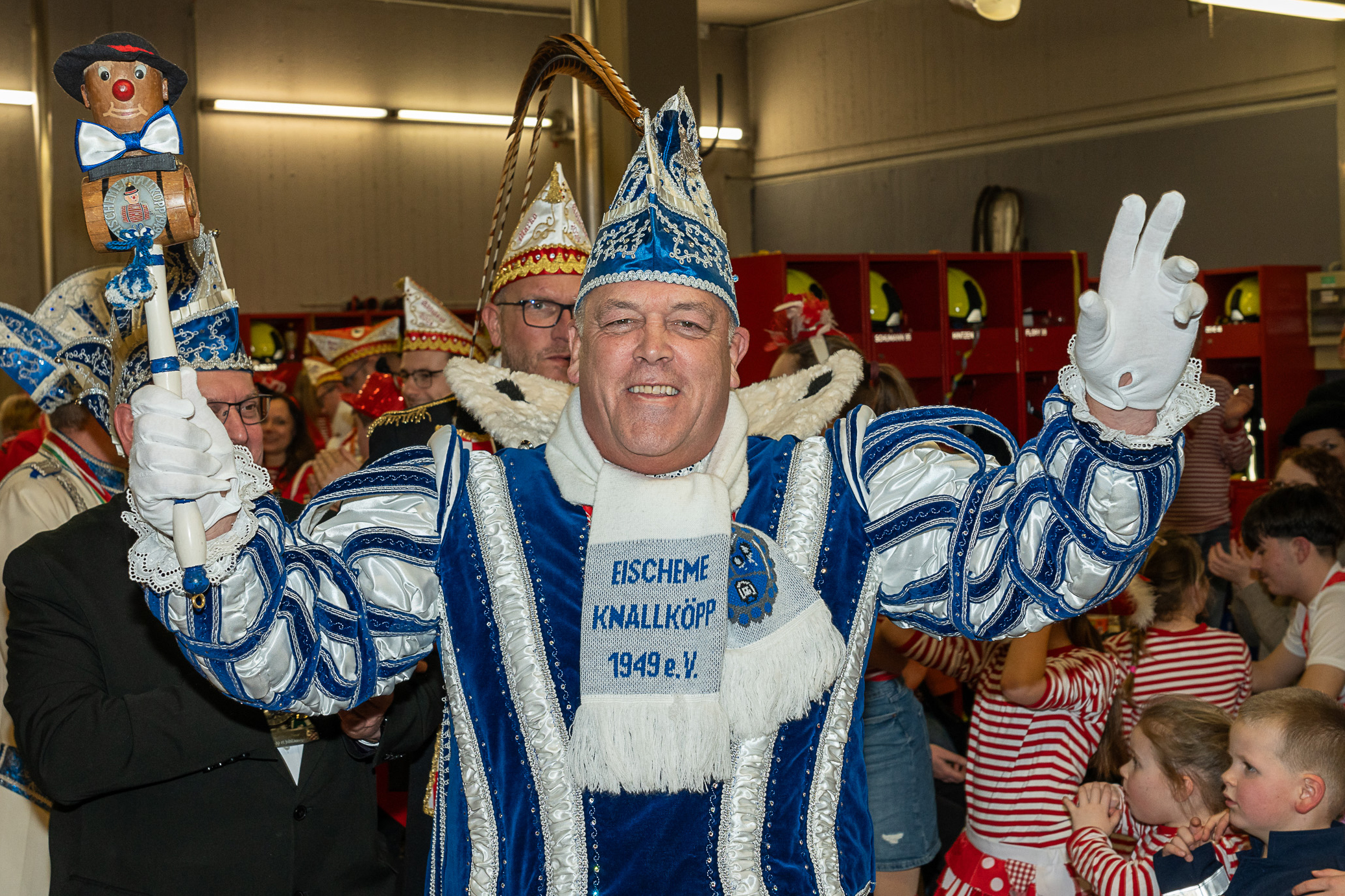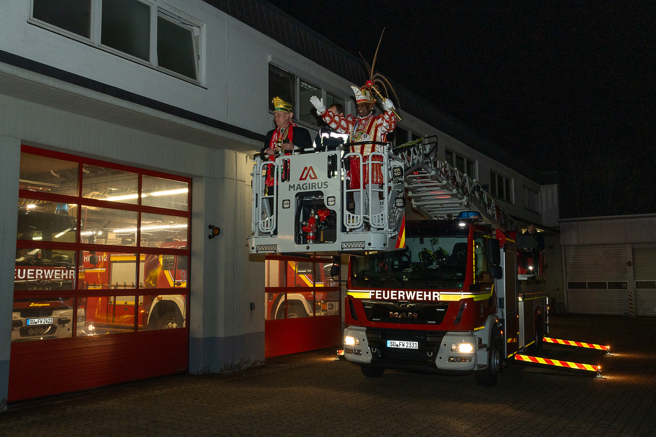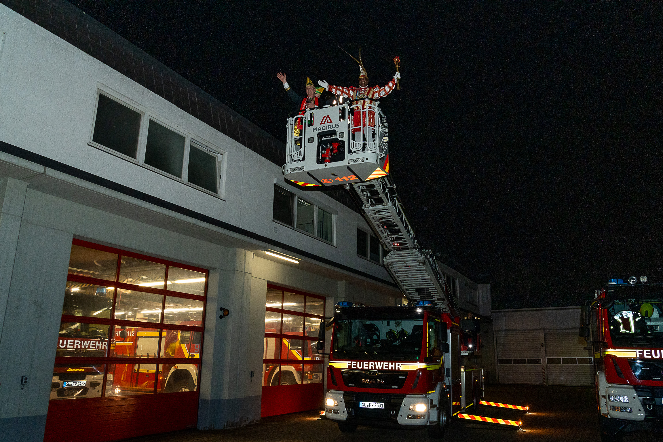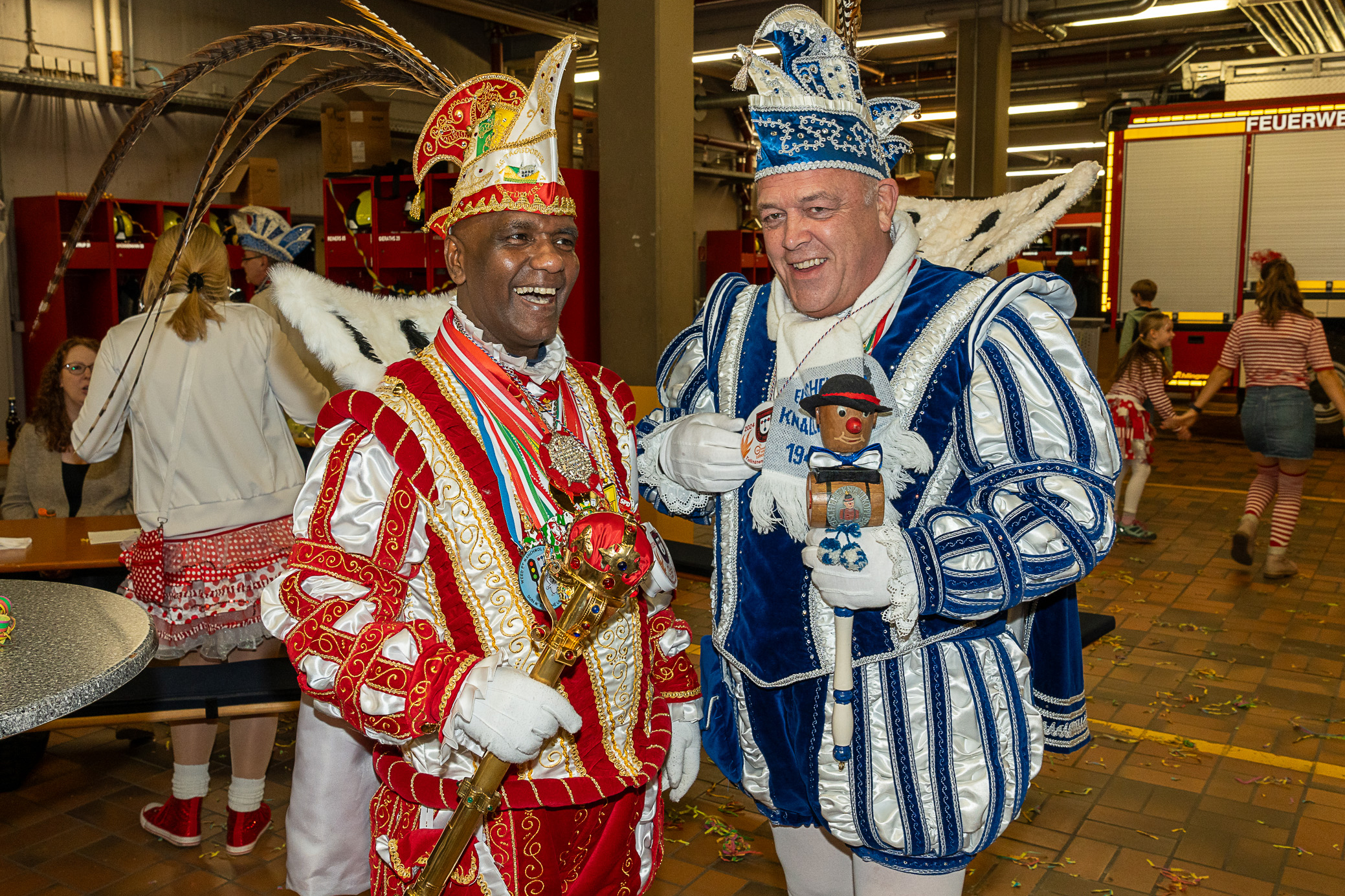 Alle fünf Troisdorfer Dreigestirne aus den Ortsteilen Spich, Müllekoven, Eschmar, Friedrich-Wilhelms-Hütte und dem Stadtzentrum hatten sich zum Empfang angemeldet – leider gab es krankheitsbedingt den ein oder anderen Ausfall. Den Anfang machte das Spicher Dreigestirn mit Prinz Gandi I., dem obersten Feuerwehrchef des Rhein-Sieg-Kreises, Kreisbrandmeister und ehemaligem Leiter der Feuerwehr Troisdorf, Stefan Gandelau, von den Löschhaien Spich. Auch andere Tollitäten haben Verbindungen zur Feuerwehr: Fast alle aus dem Müllekovener Dreigestirn sowie dem Kreis ihrer Adjutanten sind Mitglieder der Löschgruppe Müllekoven. Prinz Ben I. vom Hüttener Kinderdreigestirn ist Mitglied in der Jugendfeuerwehr FWH und seine Bäuerin Toni ist bei der Jugendfeuerwehr in Sieglar. Krankheitsbedingt musste das Kinderdreigestirn ihren Besuch kurzfristig leider absagen.