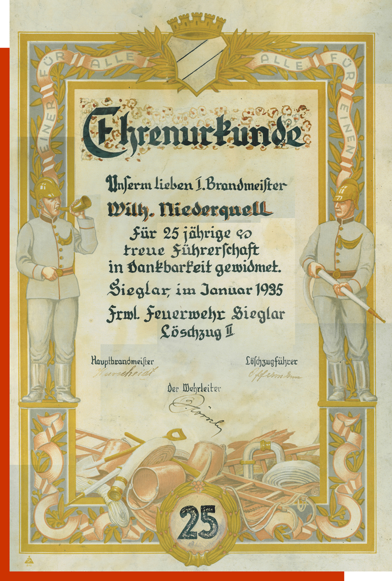 Nachdem 1906 in Sieglar Bürgermeister Johann Lindlau sein Amt antritt, beginnt für die Gemeinde der Umschwung. Es wird ein Wasserwerk gebaut, Straßen befestigt und - man könnte es mit den heutigen Worten "fit gemacht für das nächste Jahrhundert" beschreiben - Sieglar mit seinen Orten den vorherrschenden Gegebenheiten angepasst. Um auch den Forderungen der Oberregierung der Rheinprovinz endlich genüge zu tun, wird durch den dann als Branddirektor bezeichneten Bürgermeister Lindlau, am 01.11.1909 in Oberlar, die erste Freiwillige Feuerwehr der Gemeinde Sieglar als Löschzug gegründet. |