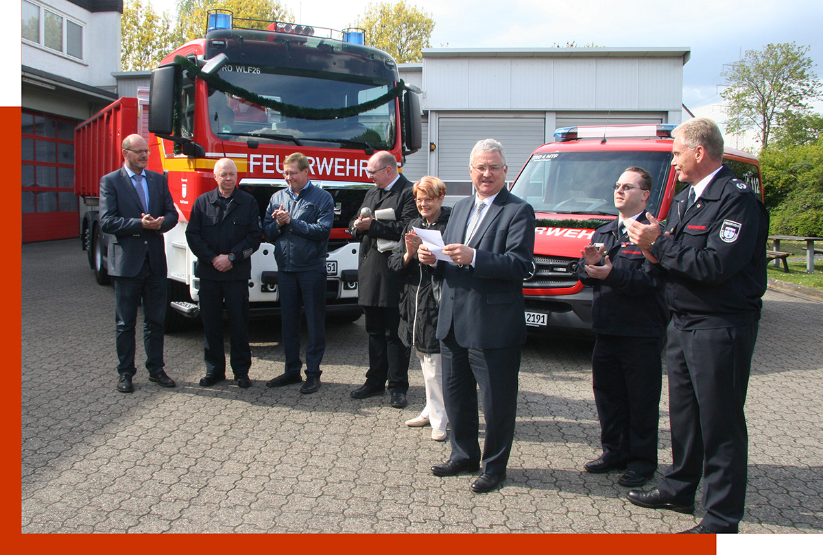 Im Rahmen einer kleinen Feierstunde auf der Feuer- und Rettungswache wird am 13.12. von Bürgermeister Klaus-Werner Jablonski offiziell der Schlüssel für das neue Löschfahrzeug übergeben und damit das Fahrzeug in Dienst gestellt. Im Anschluss an die Schlüsselübergabe erhält das Fahrzeug und die Kameradinnen und Kameraden der Löschgruppe von Pfarrer Hermann-Josef Zeyen sowie Pfarrer Michael Lunkenheimer einen ökumenischen Segen. Als Dank für die Unterstützung erhält Sachgebietsleiter Hans-Jürgen Spies ein Miniaturmodell unseres Löschfahrzeugs, welches von Kamerad André Bergmann in mühevoller Arbeit gebaut wurde. |