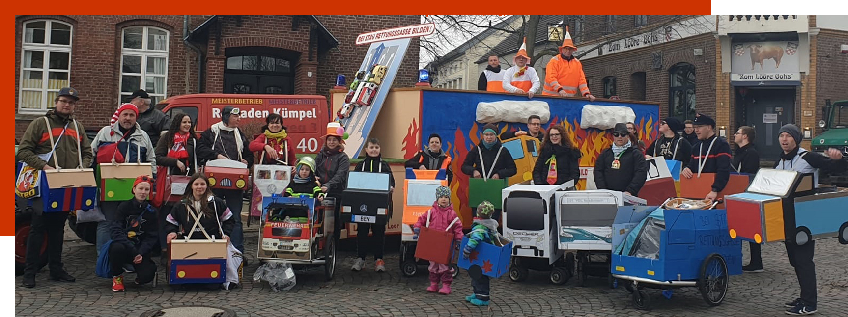 Den Mitgliedern der Löschgruppe ist das Thema "Rettungsgasse" derart wichtig, dass sie am 04.03.2019 mit insgesamt 35 Teilnehmern unter dem Motto "Bei Stau-Rettungsgasse bilden!" am Sieglarer Rosenmontagszug teilnehmen. Zwischendurch gibt es mitten im Zug auch mehrere Choreografien, wobei die "Fahrzeuge" mitten im Rosenmontagszug eine Rettungsgasse bilden. |