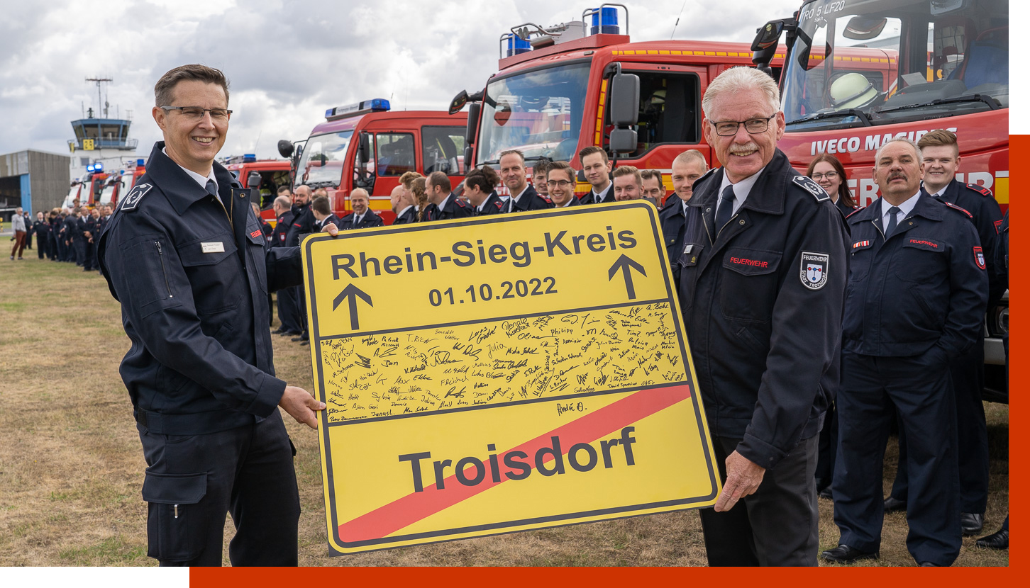 Der Wehrführer der Feuerwehr Troisdorf, Stefan Gandelau, wird neuer Kreisbrandmeister des Rhein-Sieg-Kreises. Zu seiner Verabschiedung empfangen ihn am 25.09. alle Einheiten mit ihren Fahrzeugen am Flugplatz in Hangelar am Rande des Rollfelds, nach seinem Überraschungsrundflug mit einem Sportflugzeug über sein neues Einsatzgebiet. |