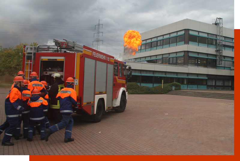 In der Bus- und Lockhalle auf dem Gelände der RSVG bricht am 28.09. ein Großbrand aus. Die parkenden Busse in der großen Halle stehen in Brand. Mehrere Mitarbeiter werden vermisst. Was sich zunächst schrecklich anhört, ist in der Realität das geplante Übungsszenario für die heutige Großübung der Jugendfeuerwehr Troisdorf, die durch die Kameradinnen und Kameraden der Löschgruppe vorbereitet und begleitet wird. |