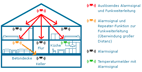 Um umfassenden Schutz nicht nur eines einzigen Zimmer zu gewährleisten, können mehrere Rauchmelder auch über einzelne Stockwerke hinweg über Funk drahtlos miteinander verbunden werden. Auch die Ansteuerung eines Alarmmoduls für Hörgeschädigte, eines Telefonwählgerätes zur Benachrichtigung z.B. über Mobilfunk oder zur Alarmierung eines Sicherheitsdienstes ist möglich. Falls eine dieser Maßnahmen für Sie in Frage kommt: im Elektro- und Sicherheitsfachhandel oder bei Brandschutzfirmen wird man Sie professionell beraten.