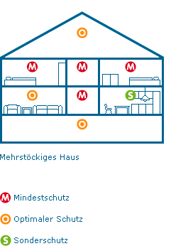 Für den Mindestschutz installieren Sie einen Rauchmelder pro Stockwerk in möglichst zentraler Position, normalerweise im Flur. Optimalen Schutz erzielen Sie, indem Sie jedes Zimmer und den Flur in jedem Stockwerk mit je einem Rauchmelder ausrüsten.