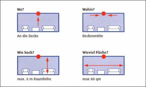 - an der Decke in der Raummitte, bzw. mindestens 50 cm von Wänden entfernt,