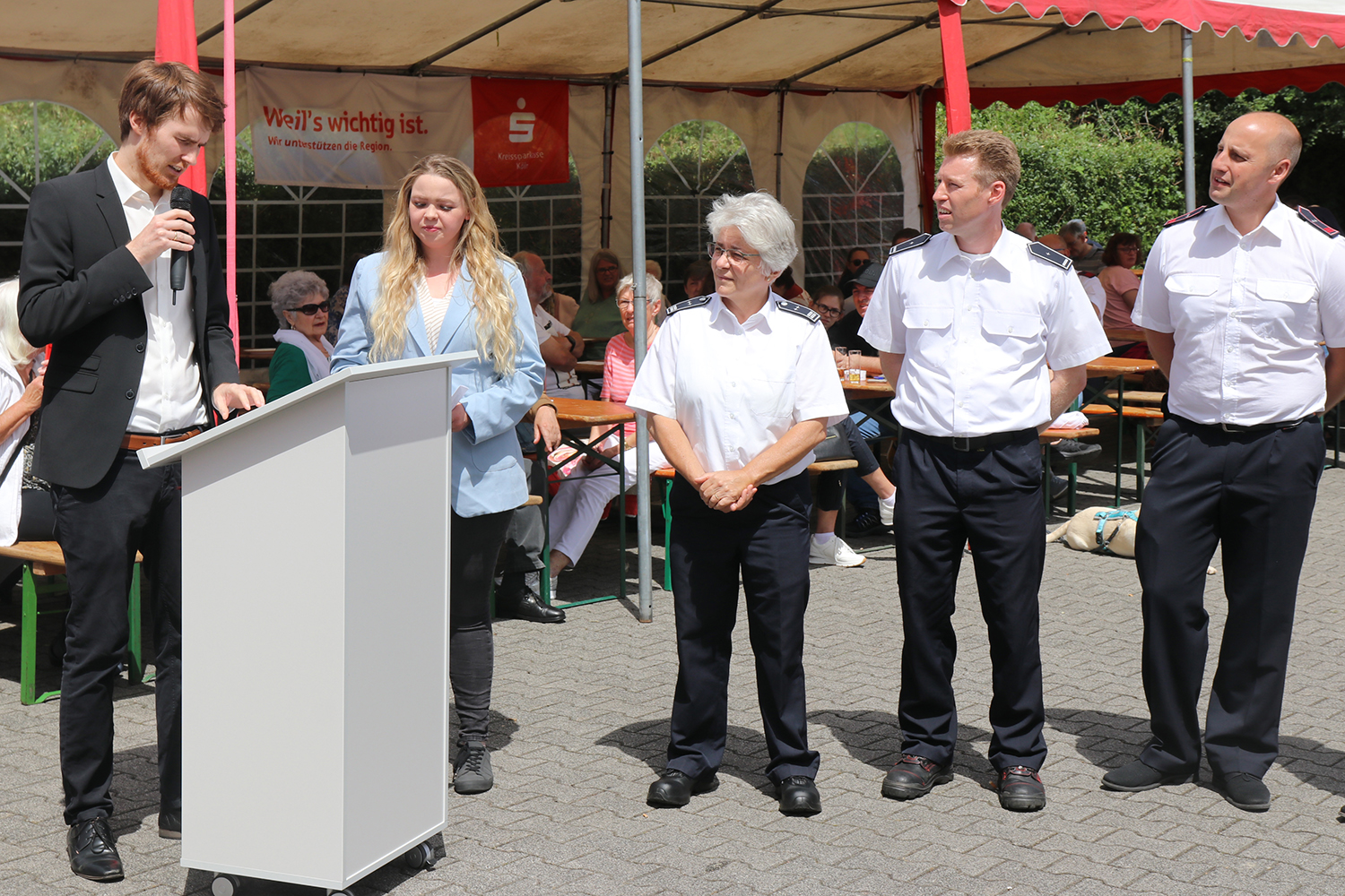 Im Rahmen einer kleinen Feierstunde auf dem Feuerwehrfest der Löschgruppe Spich wurde das neue Fahrzeug nun mit einer symbolischen Schlüsselübergabe in Dienst gestellt. Anschließend erhielt das Fahrzeug von Seelsorgerin Chantal Erdmann der Kirchengemeinde St. Johannes Troisdorf und Pfarrer Jansen von der evangelischen Friedenskirchengemeinde Troisdorf den ökumenischen Segen.
