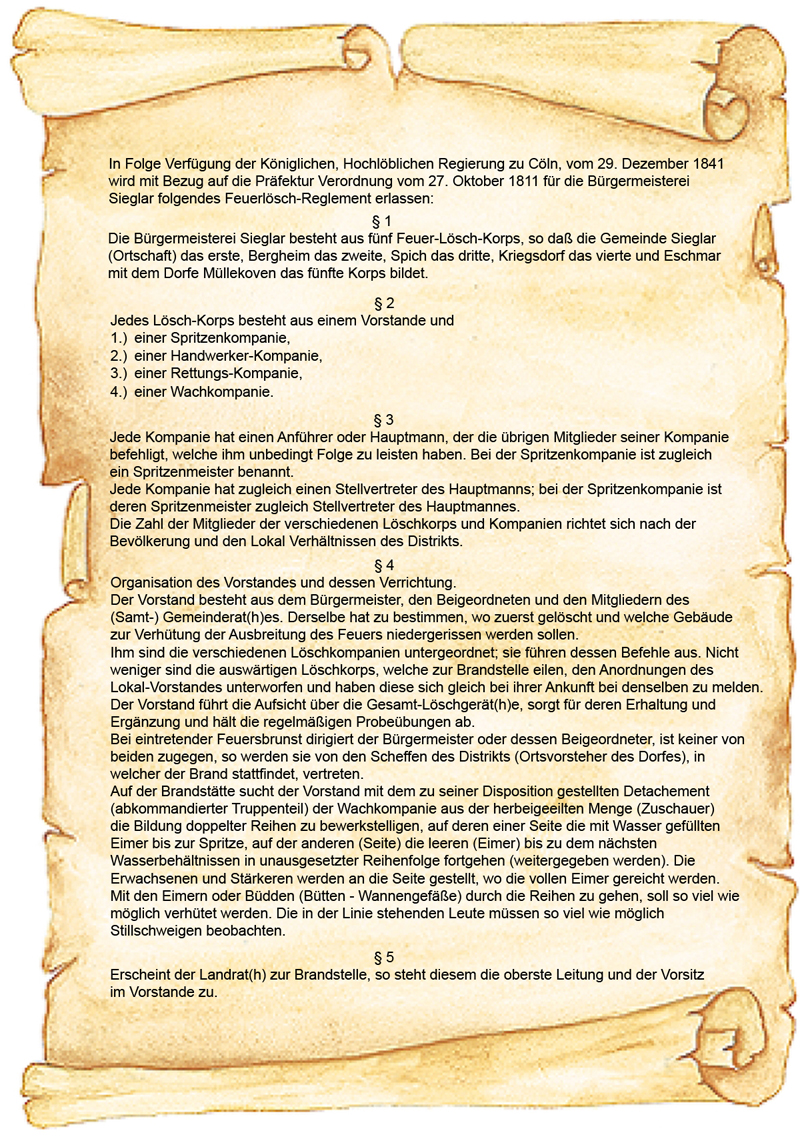Das Sieglarer Feuer-Lösch-Reglement ist in 15 Paragraphen eingeteilt. |