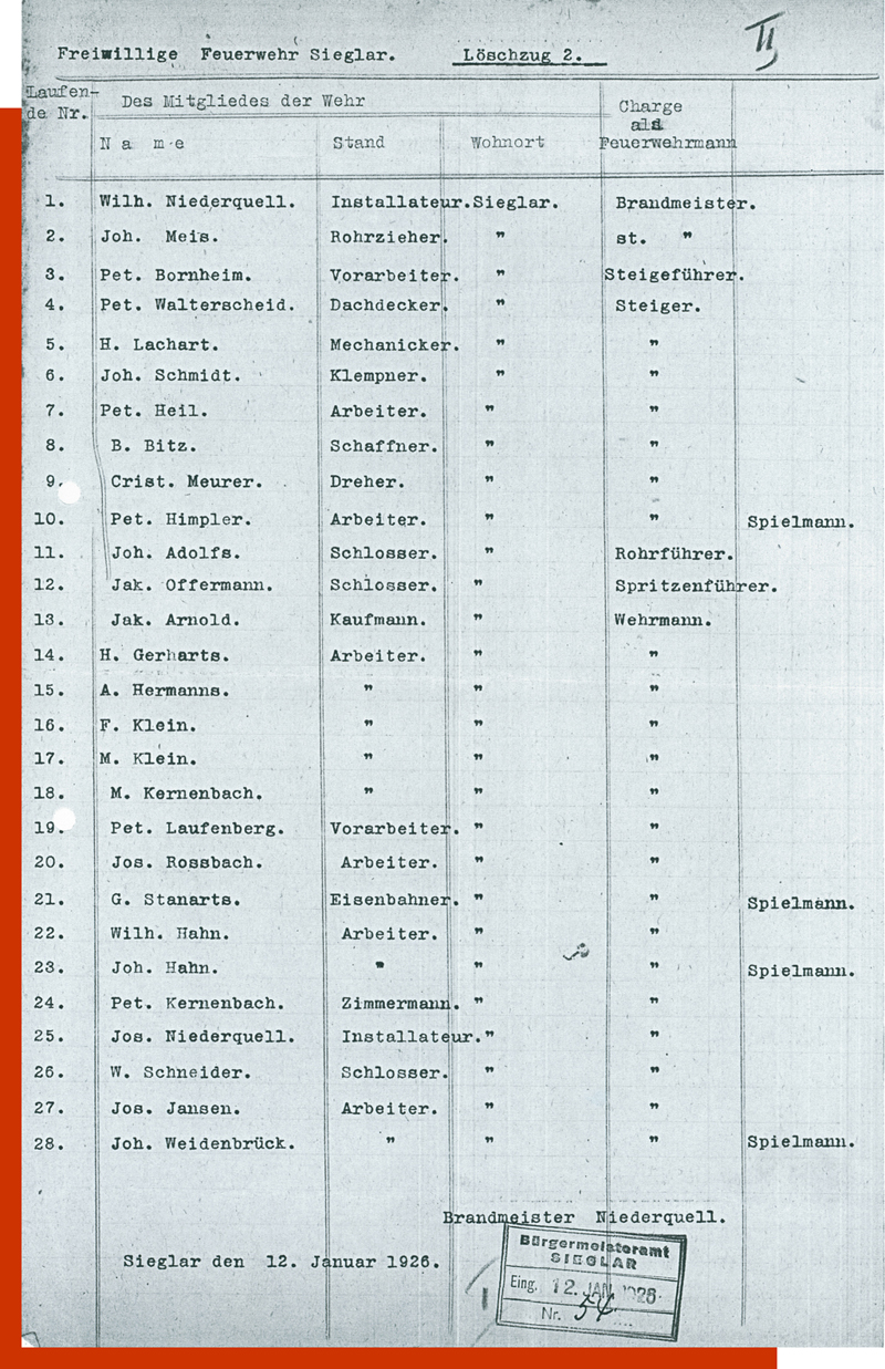 Im Verzeichnis der Hauptleute des Feuerlöschkorps der Bürgermeisterei Sieglar ist das erste Korps Sieglar wie folgt vermerkt: |