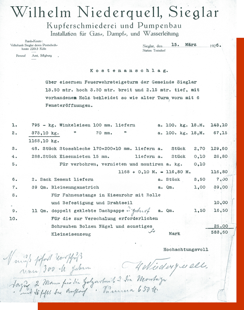 Das Sieglarer Löschkorps wird durch Läuten der großen Kirchenglocken zum Spritzenhaus gerufen. Hier wird nun durch den Polizeidiener oder ggf. den Gemeindevorsteher diese teilweise ungeordnete und nur durch Pflichtübungen geschulte Mannschaft zum Einsatz gebracht. Da man sich ja lebhaft vorstellen kann, wie etwas durchgeführt wird, wenn es jemand nicht freiwillig (und auch noch ohne Entlohnung) macht, sei ein Schmunzeln angebracht, wenn man bedenkt wie diese Löscharbeiten wohl ausgesehen haben. Hinzu kommt auch noch, dass die Gemeinderäte zu dieser Zeit mehr als knauserig sind, wenn es um Ausgaben für Ausrüstungsgegenstände für diese untalentierte und unmotivierte Truppe geht. Da auch damals schon der Feuerschutz nicht zum Nulltarif ist, wird am 14.04.1887 der Ankauf einer Feuerspritze zum Preis von 1700 Mark beschlossen. Hierzu sind im Haushalt der Bürgermeisterei allerdings nur 800 Mark vorgesehen. Die Restsumme muss aus den Einnahmen des Verkaufs von Waldabschnitten des Altenforst entnommen werden. |
