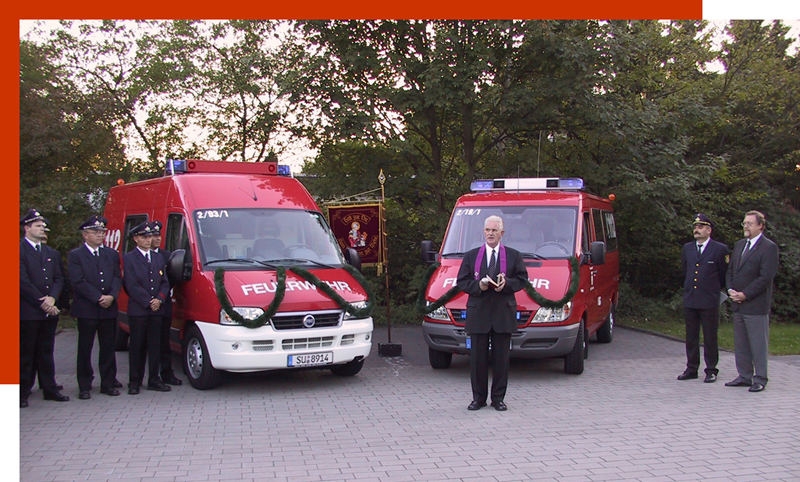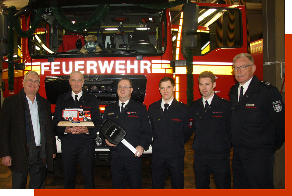 Im Rahmen einer kleinen Feierstunde auf der Feuer- und Rettungswache wird am 13.12. von Bürgermeister Klaus-Werner Jablonski offiziell der Schlüssel für das neue Löschfahrzeug übergeben und damit das Fahrzeug in Dienst gestellt. Im Anschluss an die Schlüsselübergabe erhält das Fahrzeug und die Kameradinnen und Kameraden der Löschgruppe von Pfarrer Hermann-Josef Zeyen sowie Pfarrer Michael Lunkenheimer einen ökumenischen Segen. Als Dank für die Unterstützung erhält Sachgebietsleiter Hans-Jürgen Spies ein Miniaturmodell unseres Löschfahrzeugs, welches von Kamerad André Bergmann in mühevoller Arbeit gebaut wurde. |