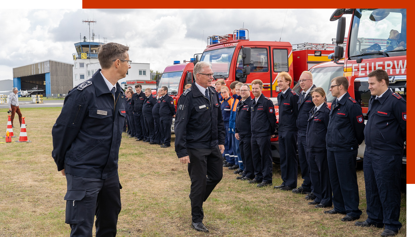 Der Wehrführer der Feuerwehr Troisdorf, Stefan Gandelau, wird neuer Kreisbrandmeister des Rhein-Sieg-Kreises. Zu seiner Verabschiedung empfangen ihn am 25.09. alle Einheiten mit ihren Fahrzeugen am Flugplatz in Hangelar am Rande des Rollfelds, nach seinem Überraschungsrundflug mit einem Sportflugzeug über sein neues Einsatzgebiet. |