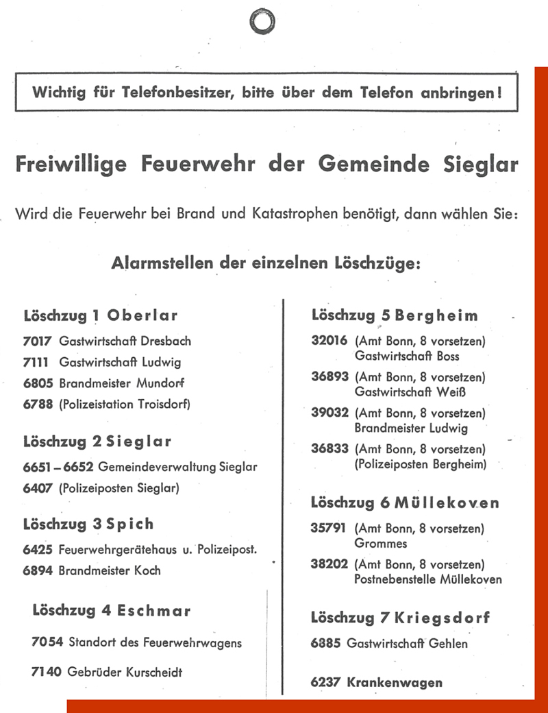 Die Versammlung wurde durch den O.B. (Oberbrandmeister) Trier abgehalten. Es wurde Bericht erstattet über die Tätigkeit der Wehr in der Zeit vom 8/8.19 bis 19/11.20 (08.08.1919 bis 19.11.1920). Ferner machte H.O.B. die neue Einteilung der gesamten Sieglarer Feuerwehr bekannt und zwar in folgender Reihenfolge: Oberlar Löschzug I, Sieglar II, Spich III, Eschmar IV, Bergheim V, Müllekoven VI, Kriegsdorf VII O.B. (Oberbrandmeister) las dann ein Schreiben vor, daß den Führer und Unterführer durch den Delegierten des Siegkreises von der O. Rheinland-Kommission das Tragen der Säbel in Ausübung ihres Dienstes erlaubt ist. |
