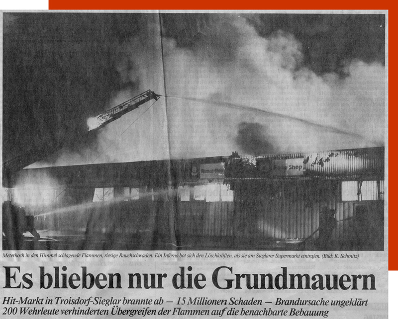 Zu einem Großeinsatz kommt es in den Nachmittaqsstunden des 22.08., als in einem Lager der Firma Reifenhäuser GmbH & Co. KG Maschinenfabrik ein Feuer ausbricht. Letztendlich wird Vollalarm für die gesamte Feuerwehr Troisdorf ausgelöst. Die Sieglarer Einsatzkräfte bekämpfen zusammen mit den hauptamtlichen Kameraden das Feuer von Beginn an. |