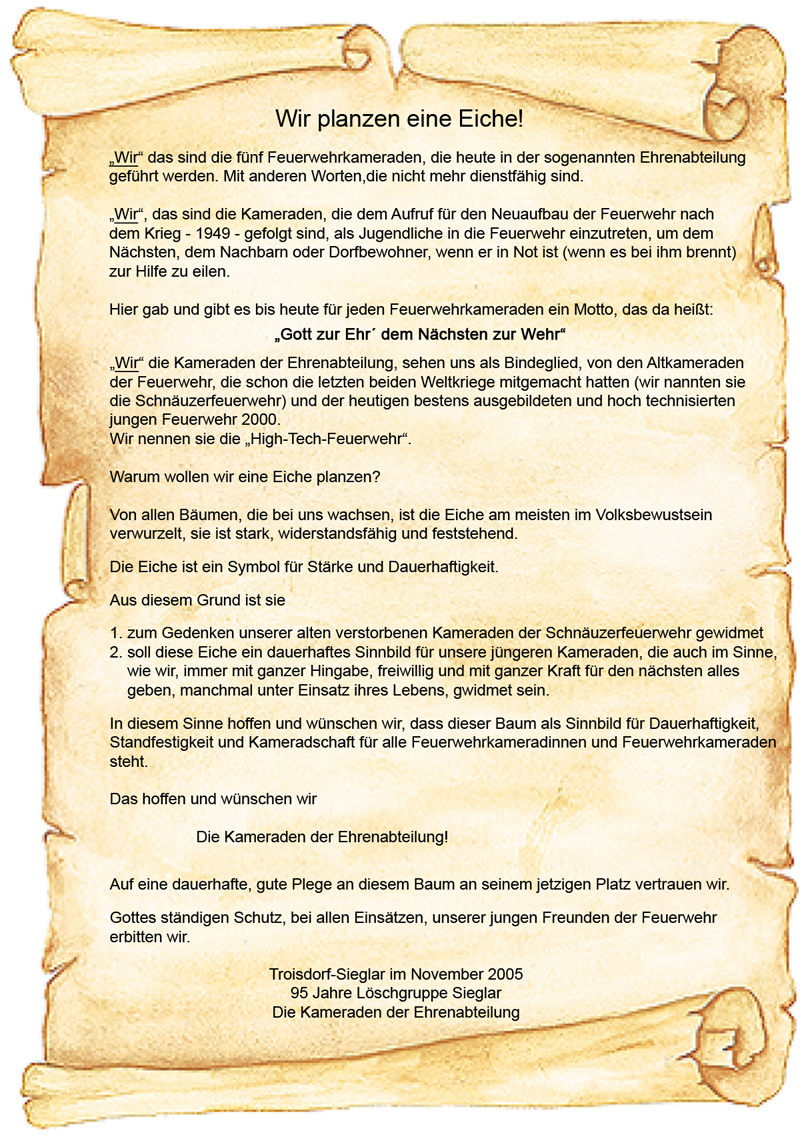 Am 01.07.1910 gründen unter anderem Mitglieder aus dem Sieglarer Turnverein unter Anweisung von Bürgermeister und Branddirektor Johann Lindlau den Löschzug Sieglar. Die Gründungsversammlung findet wohl in der Gaststätte der Familie Adolf Gehlen (nachher Gehlens Lichtspiele, heute Ecke Larstraße/Meindorfer Straße) statt. Hierzu finden sich im Kassenbuch immer wieder Einträge, welche darauf schließen lassen, dass die Gaststätte Gehlen so genanntes Vereinslokal ist. Außerdem steht zu dieser Zeit das Spritzenhaus am Pastorat und somit gegenüberliegend der Gaststätte. Bei dieser Gründungsversammlung setzt Lindlau den Kaufmann Karl Trier zum 1. Brandmeister des Löschzuges ein. Die Stärke bei der Gründung beträgt 22 Mann. Jedoch schon im Jahre 1918 finden sich Unterlagen nachdem die Stärke immer 28 Mann betragen musste. Wenn jemand ausscheidet wird offensichtlich von einer Warteliste ein neues Mitglied gewählt. |