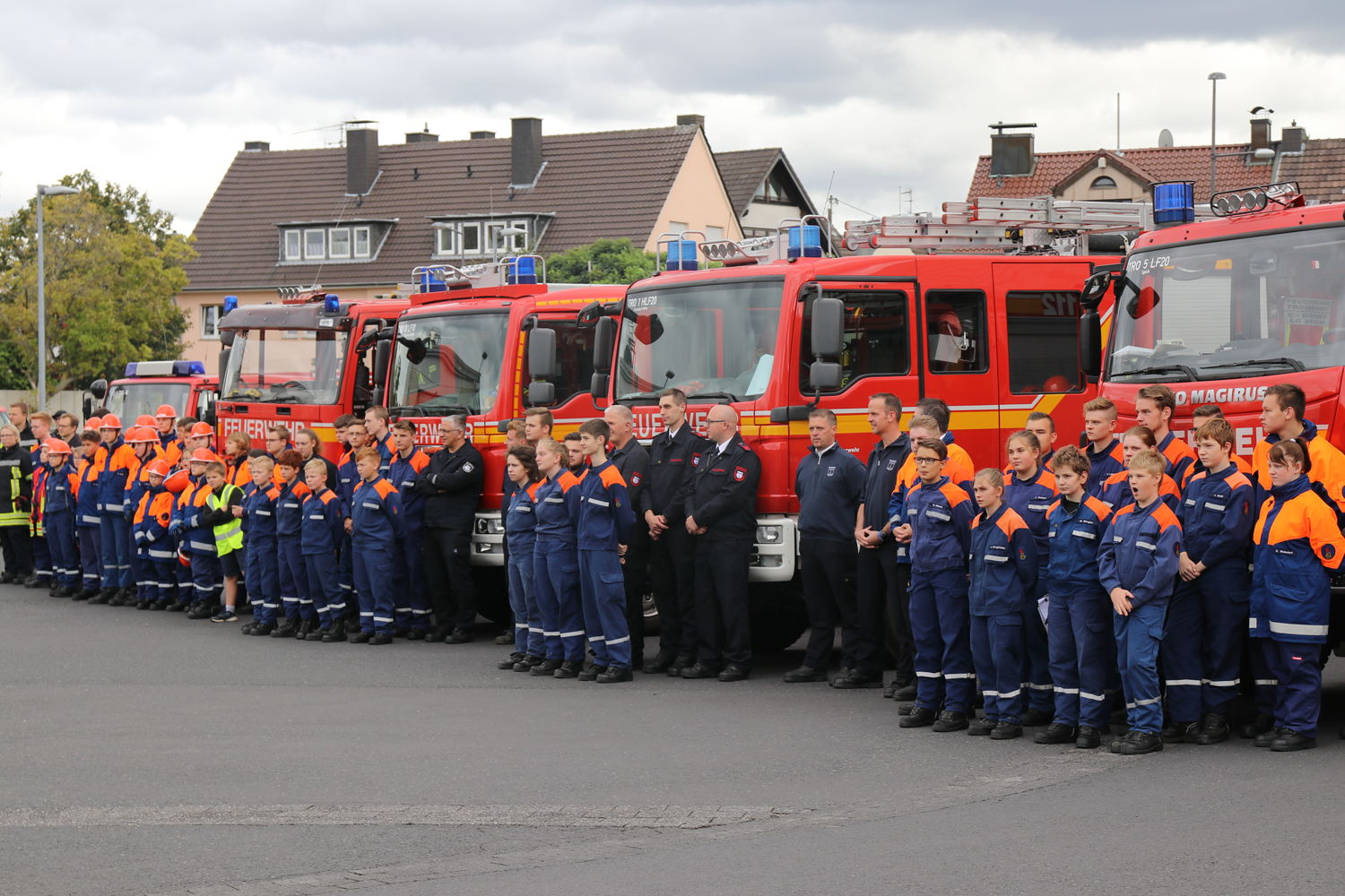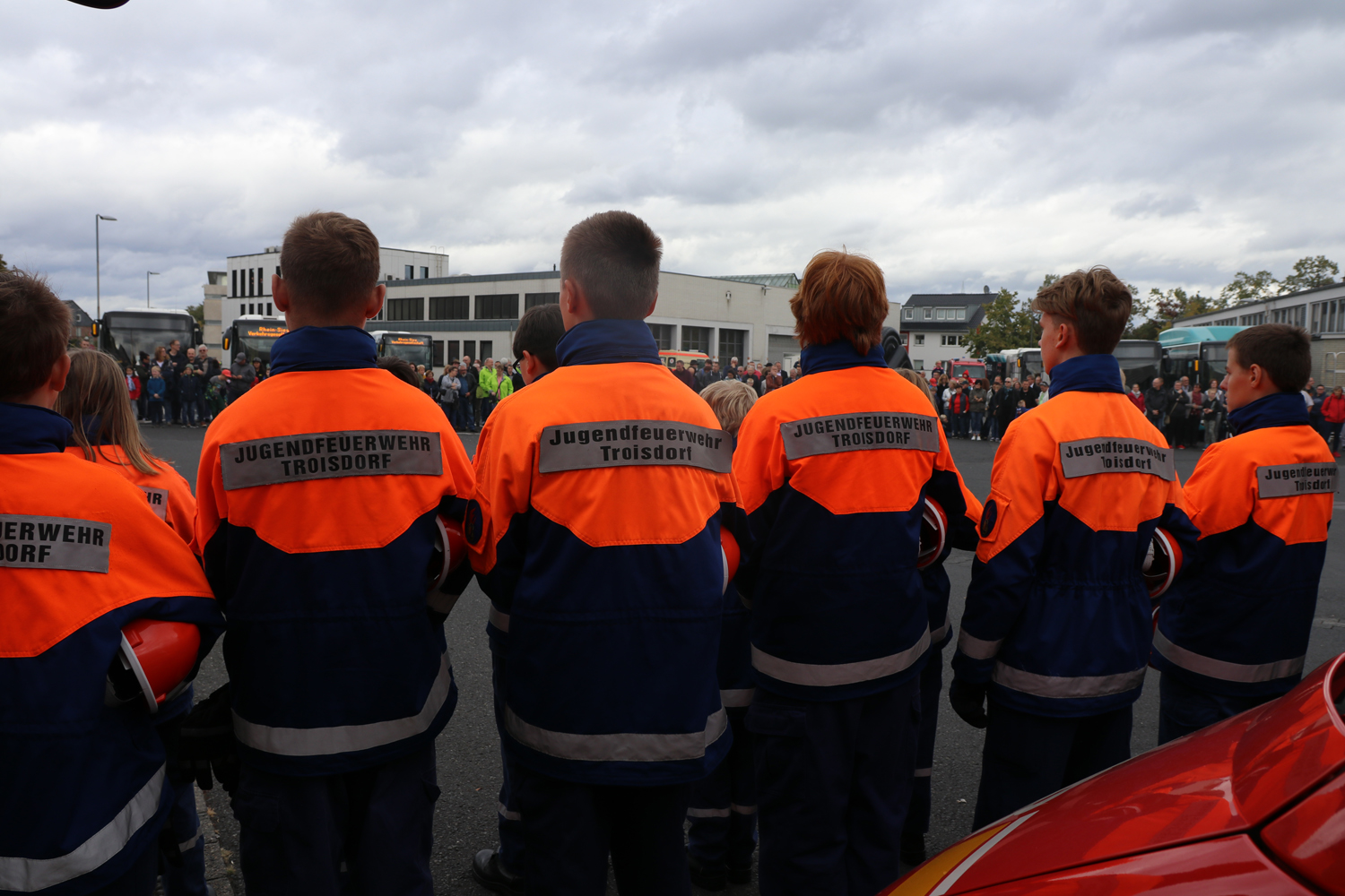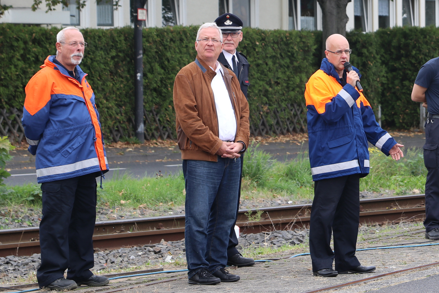 Im Anschluss an die offizielle Begrüßung von Stadtjugendfeuerwehrwart André Dekleermaeker, Bürgermeister Klaus-Werner Jablonski sowie Stadtbrandinspektor Stefan Gandelau, fuhren die Gruppen mit ihren Fahrzeugen die Bereitstellungsräume am Netto-Parkplatz im Kirchtal, am Sieglarer Schulzentrum sowie auf der Feuer- und Rettungswache an und wur-den von dort per Funk zu dem Einsatzszenario: „Brennt Bus und Lock Depot bei der RSVG in Sieglar, mehrere Menschen werden vermisst" „alarmiert“.