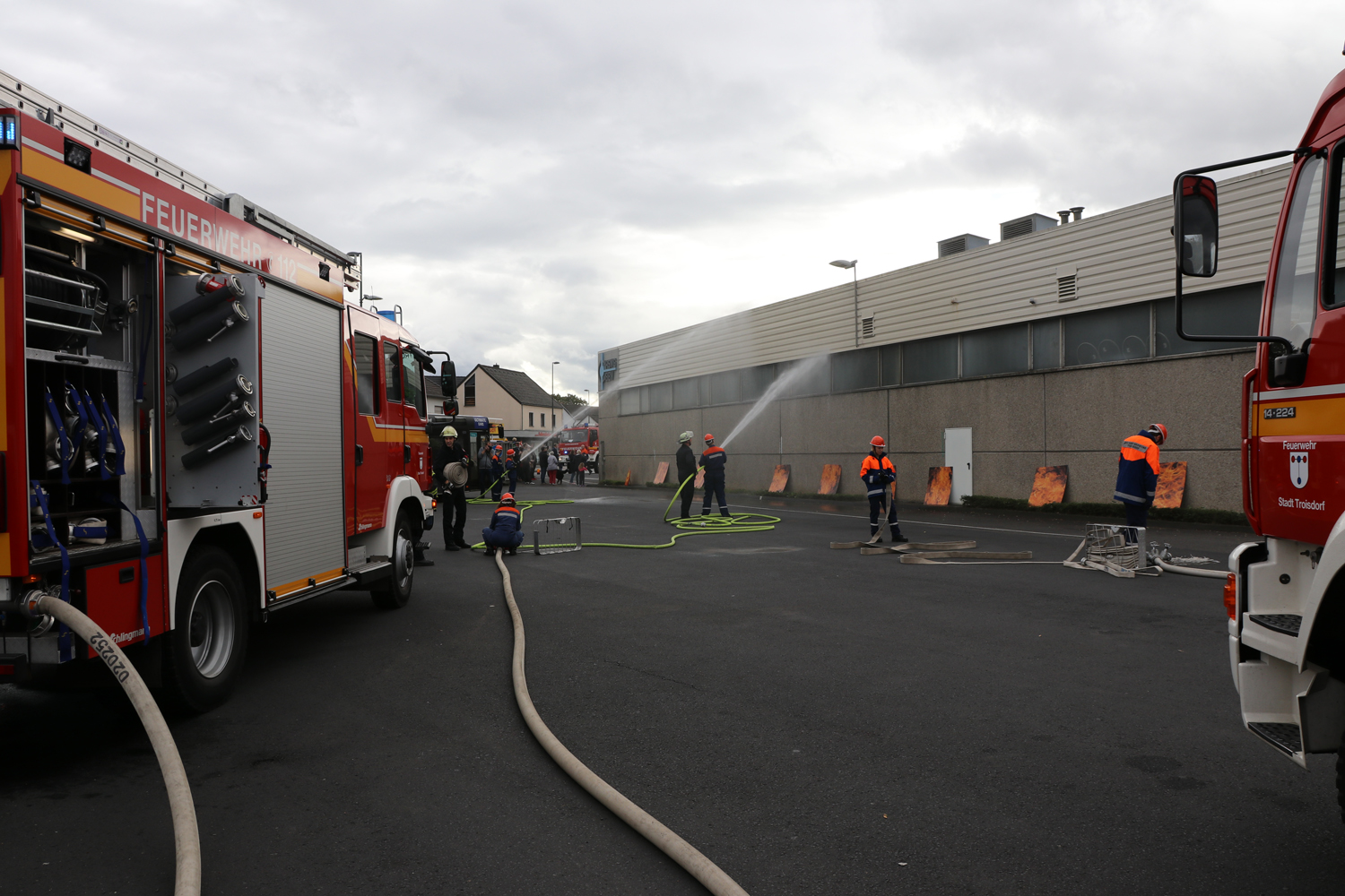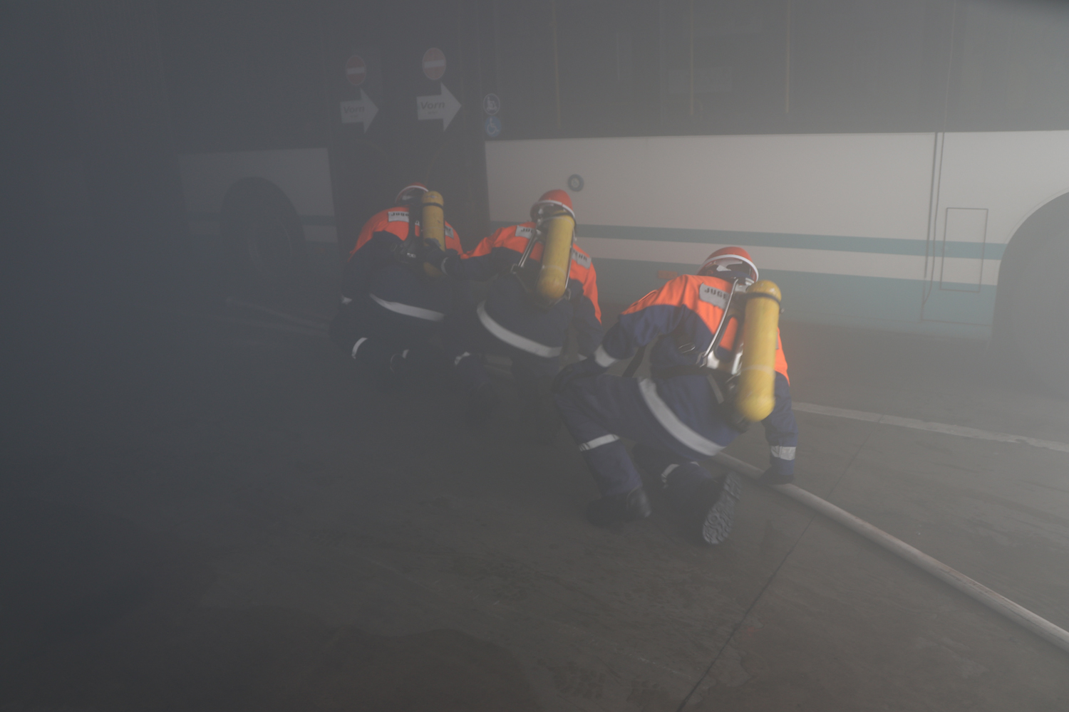Im Verlauf der Übung konnten alle Übungspuppen aus der mit Disco-Nebel verrauchten Halle erfolgreich gerettet und dem Rettungsdienst übergeben werden. Da sich das "Feuer" schnell ausbreitete wurden insgesamt 18 C-Rohre sowie ein B-Rohr vorgenommen.